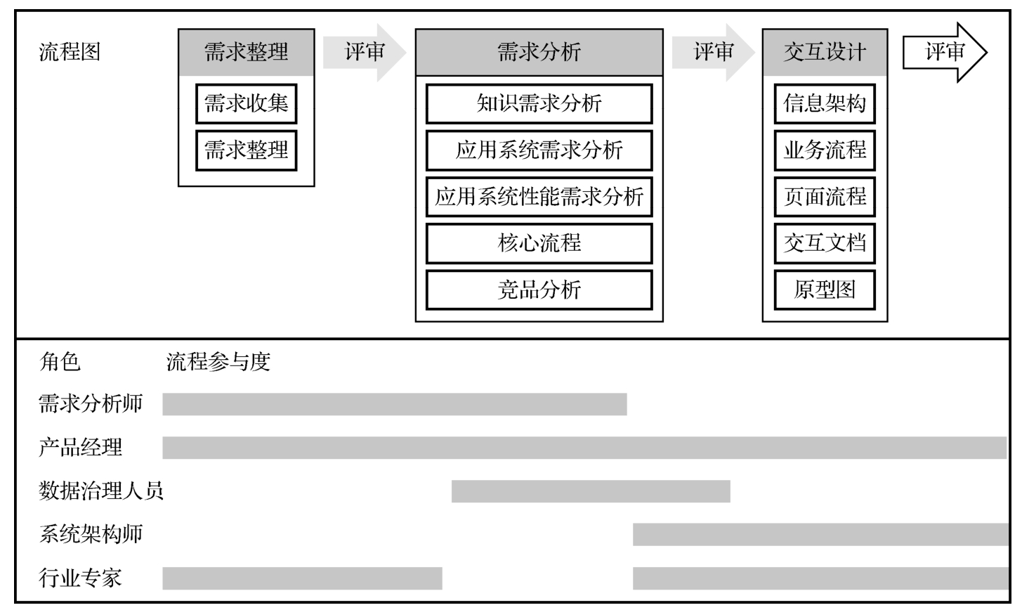 需求分析阶段根据拟实现目标的不同可划分为需求整理、需求分析、交互设计3项活动。需求分析阶段活动流程及主要参与人员角色如图5.2所示。