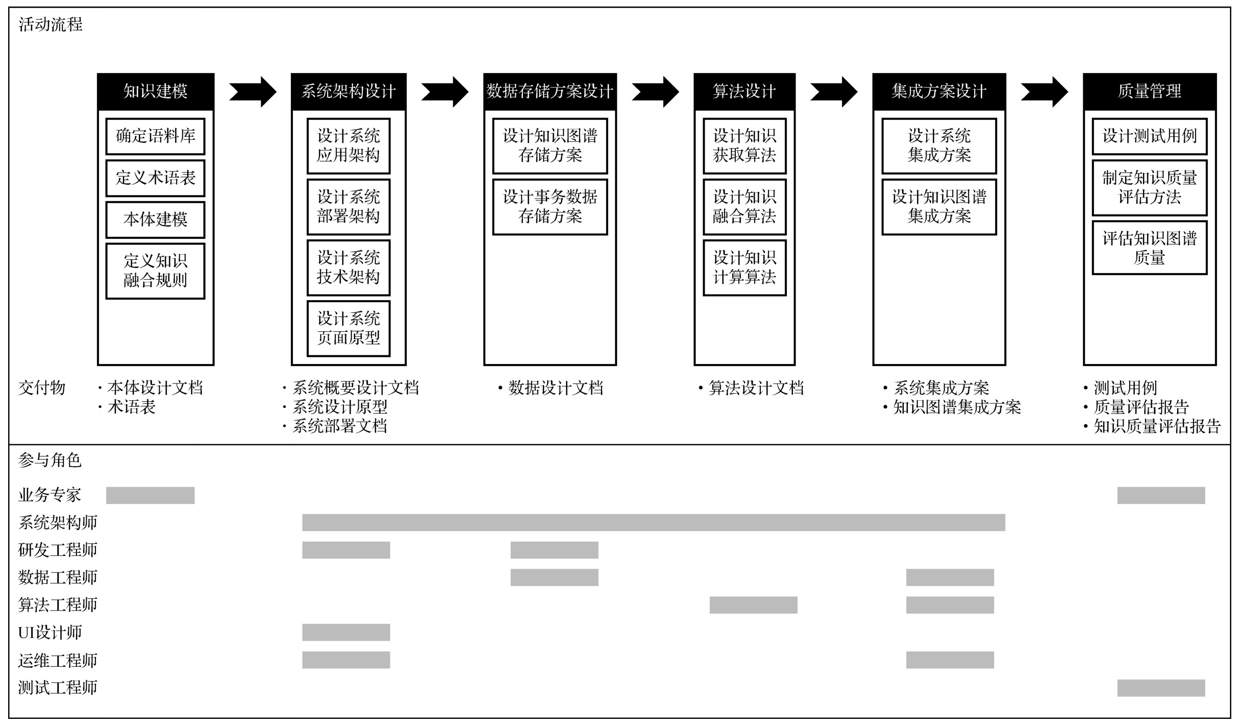 方案设计阶段根据拟实现目标的不同可划分为知识建模、系统架构设计、数据存储方案设计、算法设计、集成方案设计、质量管理6项活动,方案设计阶段活动流程及主要参与角色如图5.3所示。