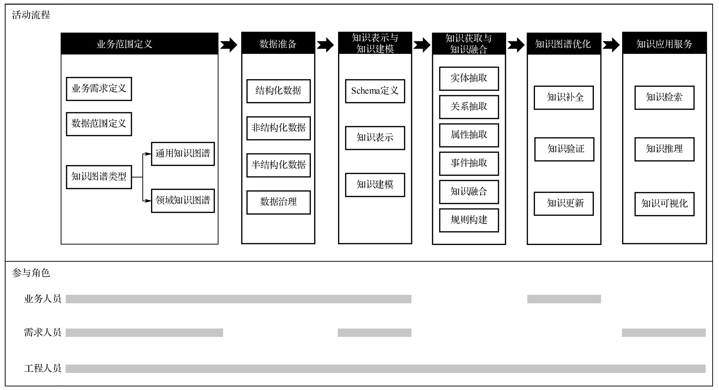 知识图谱生命周期根据构建过程及系统开发与部署过程的差异,从技术构成与工程实施方面可细分为知识图谱构建生命周期和知识图谱应用系统生命周期两个维度。其中,知识图谱构建生命周期包括知识表示、知识建模、知识获取、知识融合、知识存储、知识计算、知识应用和维护等阶段。知识图谱应用系统生命周期包括需求分析、方案设计、图谱构建、应用开发与集成部署、系统评估与验收、运营推广、管理维护等阶段。