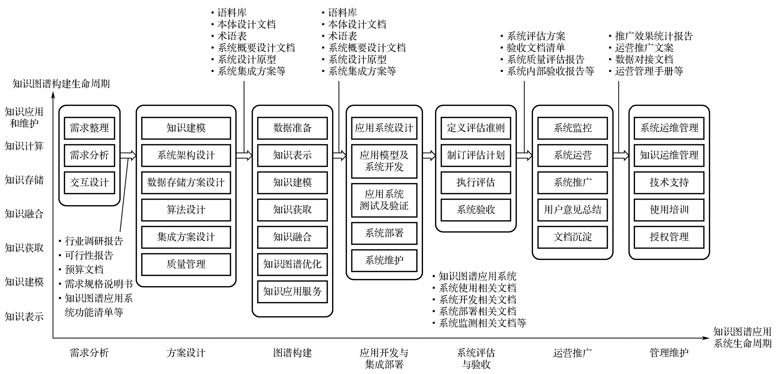 知识图谱生命周期根据构建过程及系统开发与部署过程的差异,从技术构成与工程实施方面可细分为知识图谱构建生命周期和知识图谱应用系统生命周期两个维度。其中,知识图谱构建生命周期包括知识表示、知识建模、知识获取、知识融合、知识存储、知识计算、知识应用和维护等阶段。知识图谱应用系统生命周期包括需求分析、方案设计、图谱构建、应用开发与集成部署、系统评估与验收、运营推广、管理维护等阶段。