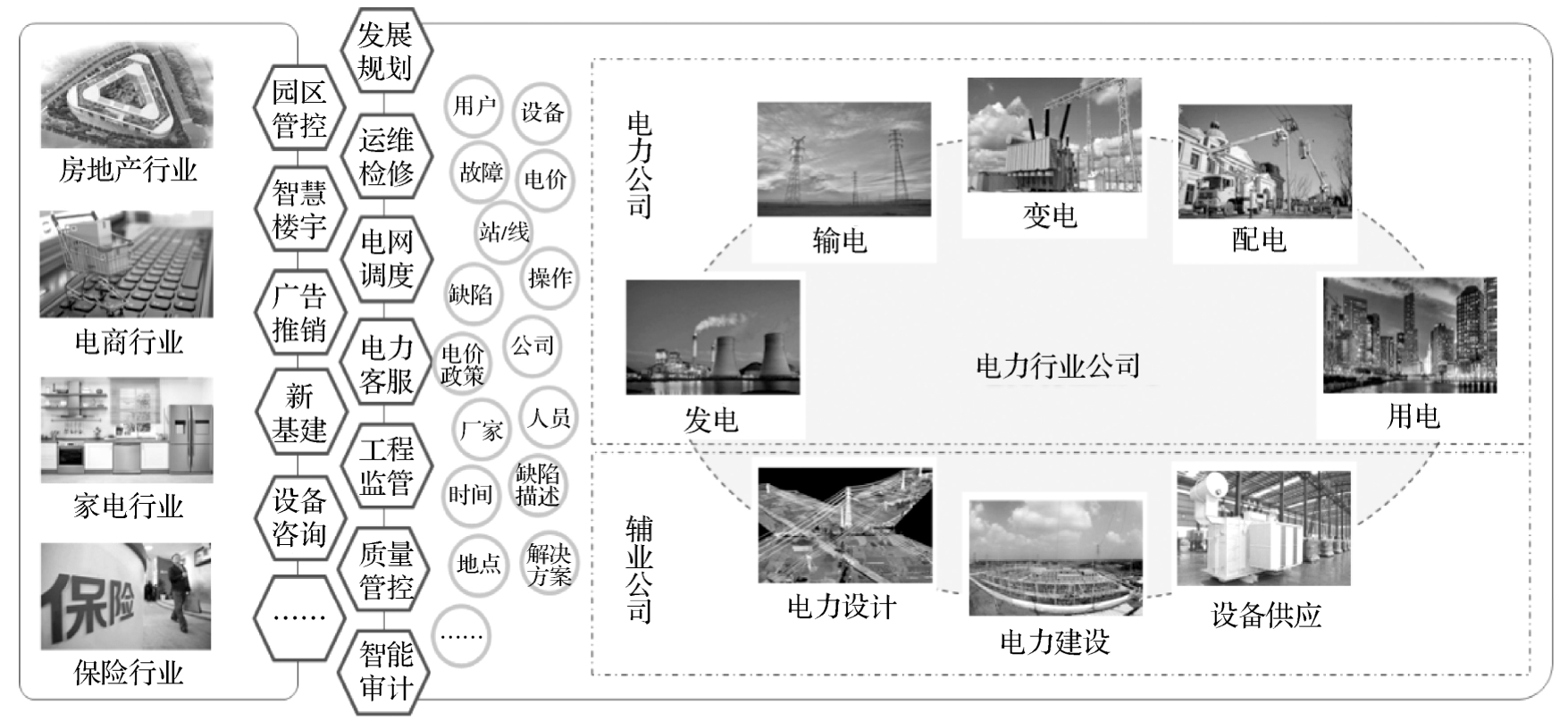 系统相关方示意如图1所示。从业务角度而言,该系统可以形成针对发展规划、运维检修、电网调度、电力客服、工程监管、质量管控等业务的能力支撑;对外有望与房地产、电商、家电、保险等行业深度合作,将电力相关数据、知识打包成为数据产品,在园区管控、智慧楼宇、广告推销、新基建、设备咨询等业务板块实现电力行业数据资产的增值变现与相关行业的智能化发展。