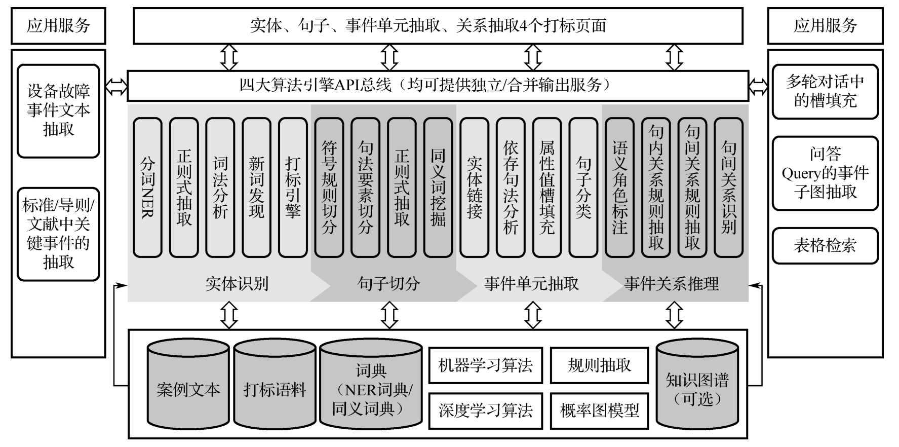 智能问答系统中的知识构建模块主要针对电力制度领域提供知识图谱构建的基础框架,提供包括基础部署环境、知识图谱本体构建管理、知识图谱抽取前端交互功能、知识图谱查询和计算服务、知识图谱存储,后台的系统管理和调度运维服务等组件,为知识图谱生产、存储和查询计算提供支撑能力。