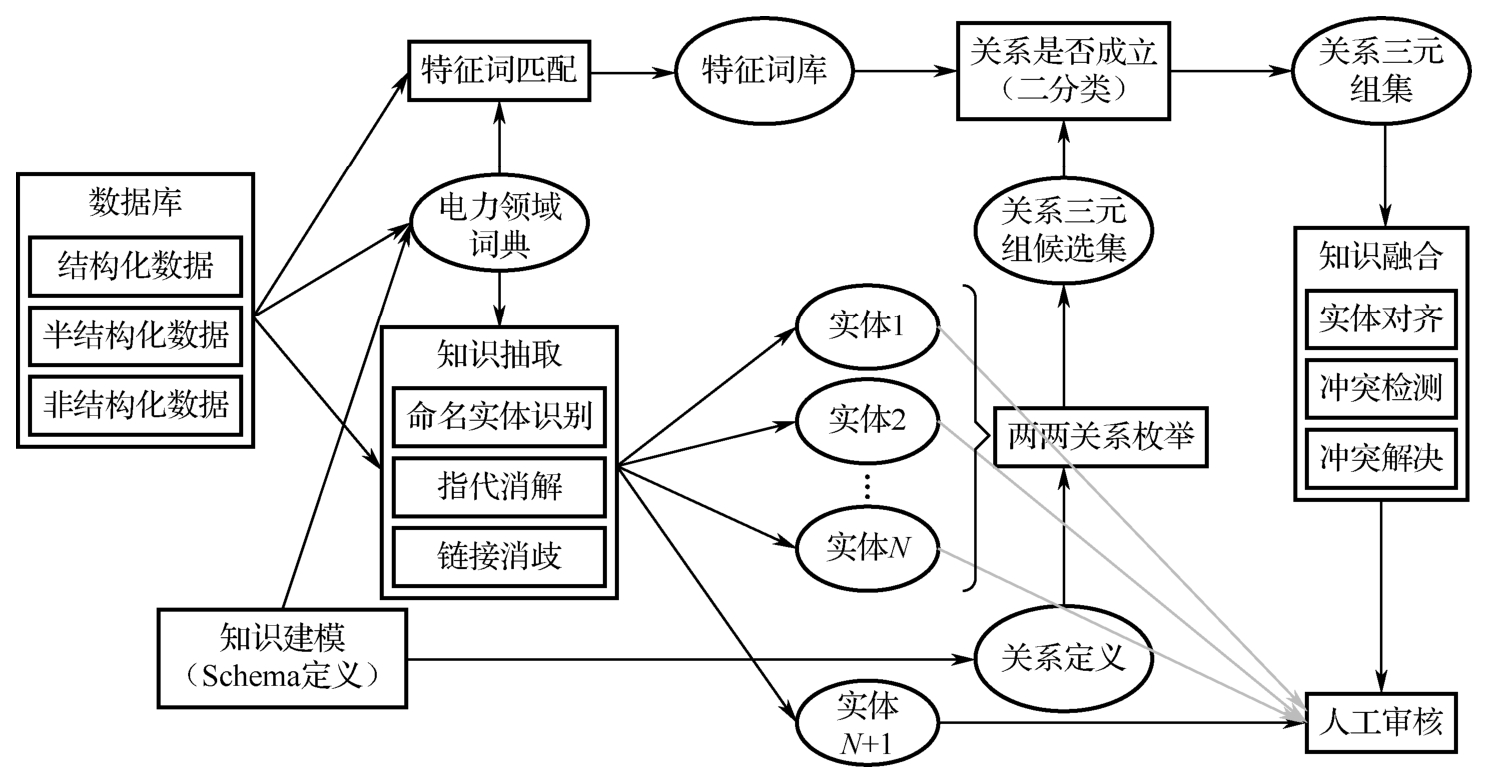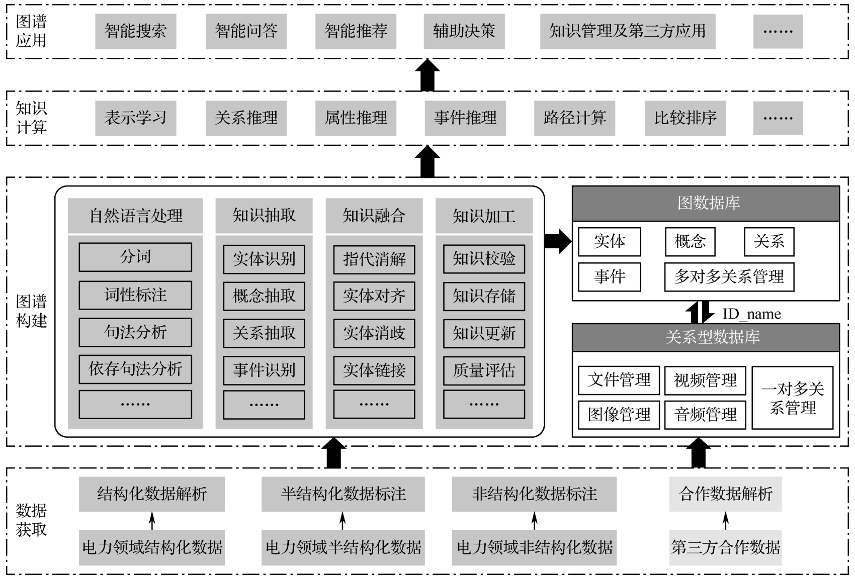 知识图谱侧重于构建结构化知识,并对其进行关联。在系统的构建过程中,存在多种异源、异构数据,这主要面临两个问题。一是来自不同数据源的数据之间是异构的,异构数据源之间可能在本体层面上有所不同(如属性名的表达不同);而且在实体层上也可能会有差异,表达同一实体会用不同的方式。二是不同数据源之间可能存在矛盾数据,由于某些不完整、错误、过时等问题导致数据之间的冲突可能会对信息的准确性产生影响。例如,“国家电网有限责任公司”“国家电网公司”“国网”是否指代同一家机构等。结合专家知识的决策树等机器学习算法训练结果,就可以判断两组词是否指代一个实体,或基于“嵌入式表示”(Embedding)的方法将不同词映射到统一的向量空间中,最后通过测量词向量之间的距离来执行“实体对齐”。此外,知识图谱的构建不是一蹴而就的过程,系统是一个随时间变化的知识图谱。当引入新知识时,为确保知识图谱满足需求,还需要补全、纠错、外链、更新等验证步骤,因此,知识图谱的构建是一个不断更新迭代的动态过程。