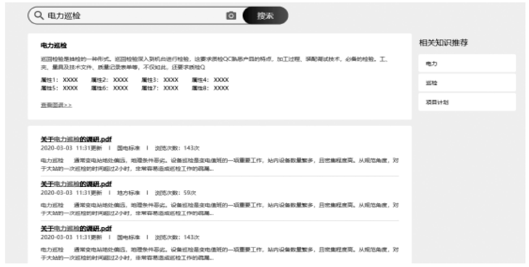 智能搜索模块(见图2)支持电力运检领域台账、规程、标准、技术规范、导则、细则等知识库信息,以及检修工单、工作票、修试记录等文本数据的大规模存储与异构数据库交互检索,实现相关制度标准文本的智能检索。
