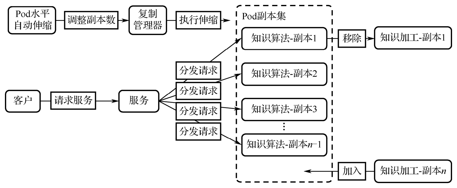 容器调度以自动化方式完成整个集群的资源管理、Pod调度、弹性伸缩、安全控制、系统监控和纠错等。知识加工相关的服务将被打包成镜像,封装在Pod并被Kubernetes管理,通过指定的控制器和调度策略依据实际资源完成对一组Pod副本的创建、调度及全生命周期的自动控制任务,实现知识加工相关的服务自动更新及软件模式的负载均衡,保障调度性能。