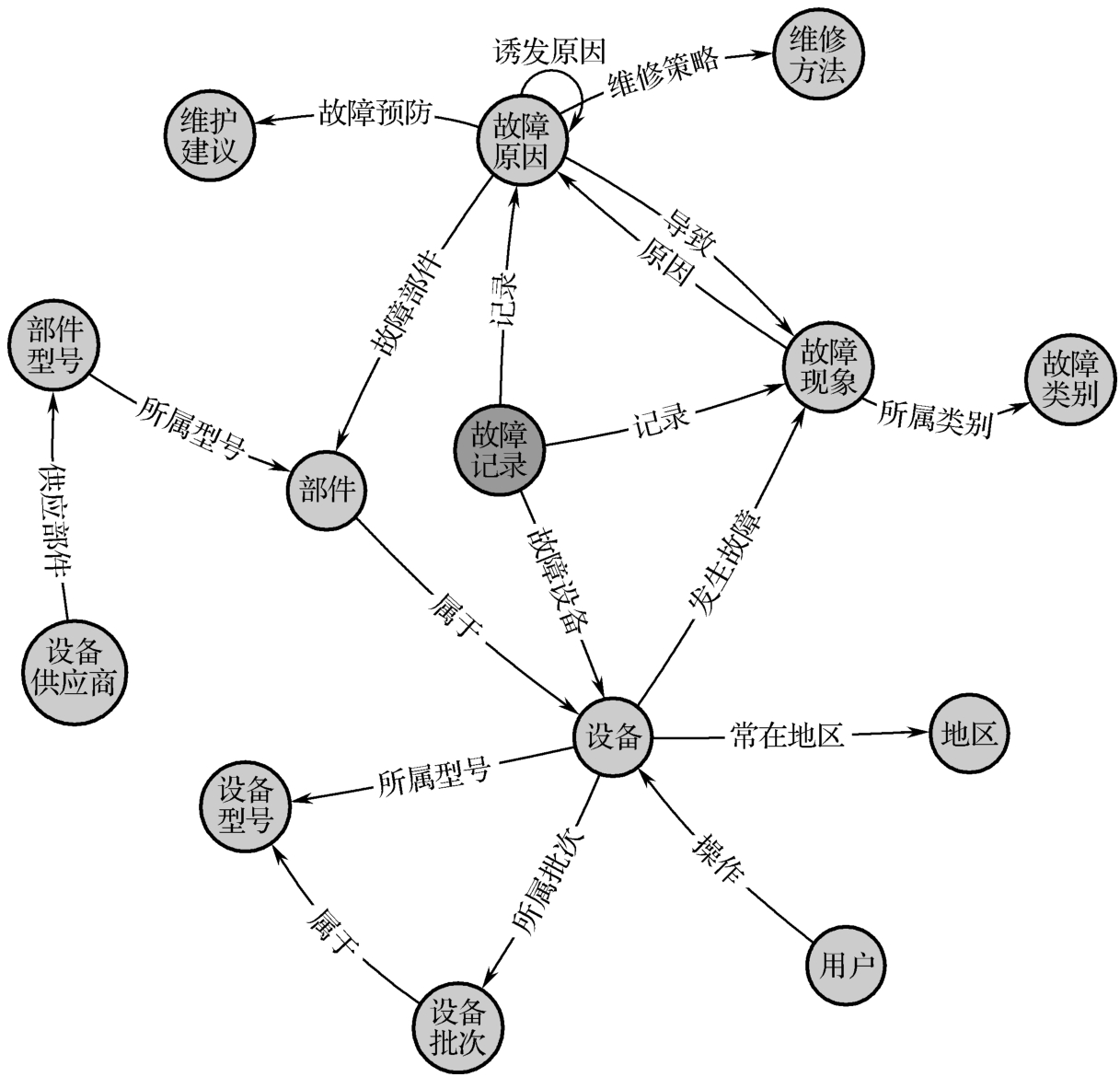 在设备维护/维修过程中最重要的是方法的正确性与时效性。设备故障的原因一般可分为直接原因与根本原因,相同的直接原因可能有多种潜在的根本原因,而同一故障现象可能由不同直接原因导致,这是设备维护/维修过程中的难点。为解决这些问题,基于历史维护/维修数据,提取设备型号、故障现象、故障原因、零部件、检修策略等信息,构建实体间的因果、影响、关联、从属等关系,建立设备维护/维修知识图(见图5)。根据该图中的关系,推断设备故障原因。对于可能有多种原因的故障,使用目标部件关联的整个网络特性,结合历史数据先验概率与其他现象,预测导致设备故障最可能的原因,并按优先级给出维修检查计划。该过程可能需要的应用包括可视化故障分析系统、设备故障检修智能检索(问答)系统、设备故障预测算法等。