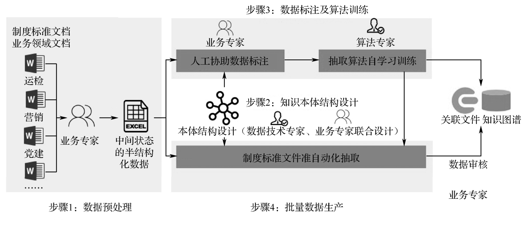 国家电网企业标准制度协会制度标准数据属于非结构化并夹杂半结构化数据,需要业务专家拆解得到中间状态的半结构化数据,通过知识图谱抽取功能进行抽取。抽取工作分为两个阶段:先期通过人工协助数据标注,沉淀数据,用于算法训练;算法提升后,后续逐步减少人工标注,通过系统来完成自动化抽取,最后数据经审核后入库。国家电网企业标准制度协会制度标准数据生产过程如图3所示。