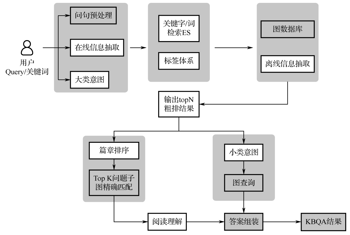 首先,问答系统利用语义解析在线抽取得到的问句的子图信息,并和文本信息相结合,然后对问句的大类意图进行判别,基于不同的意图在已有的知识图谱上对问句关键信息进行搜索,筛选可能包含答案所需的制度子图。搜索技术包括了交互式的文本匹配模型、篇章排序模型,倒排索引检索技术以及图结构的相似性匹配等。根据问句意图和知识图谱系统中专家的先验知识,给问句不同部分和不同的匹配方法分配了不同的权重和阈值。实现了问句语义在已有知识图谱中的准确匹配,从而获得了基于现有数据库的具有最高置信度的答案范围。