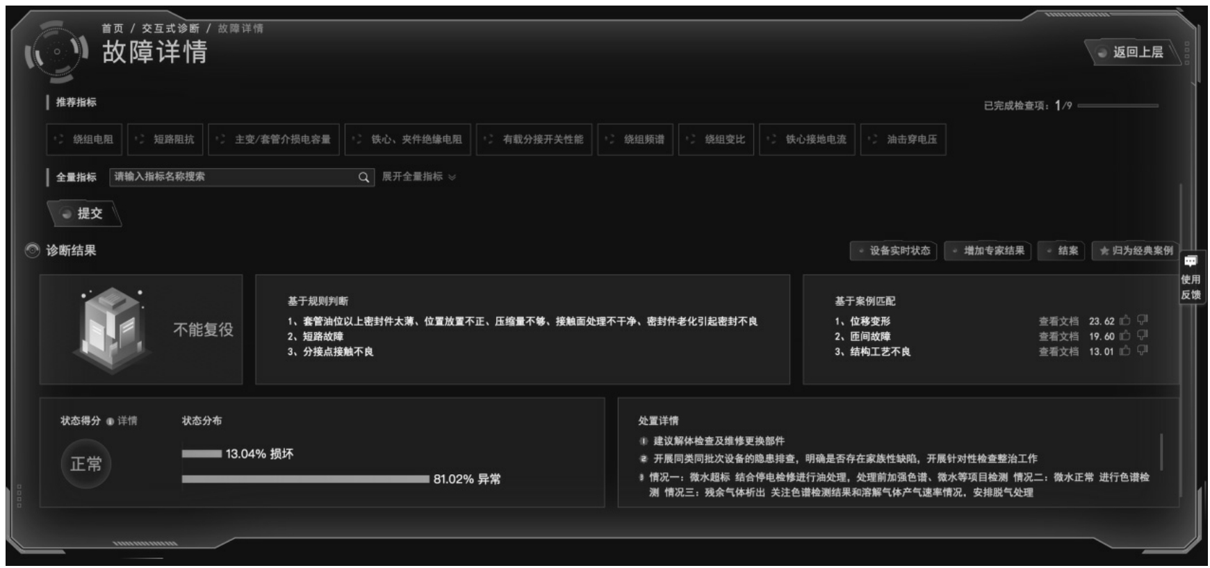 (2)所完成系统仅可对变压器等电网主设备进行故障诊断,未能覆盖全部种类电网设备(如断路器、线路等)。后续须建立涵盖不同变电主设备质量、设备状态管理和设备处置相关规定的设备质量信息规则引擎。