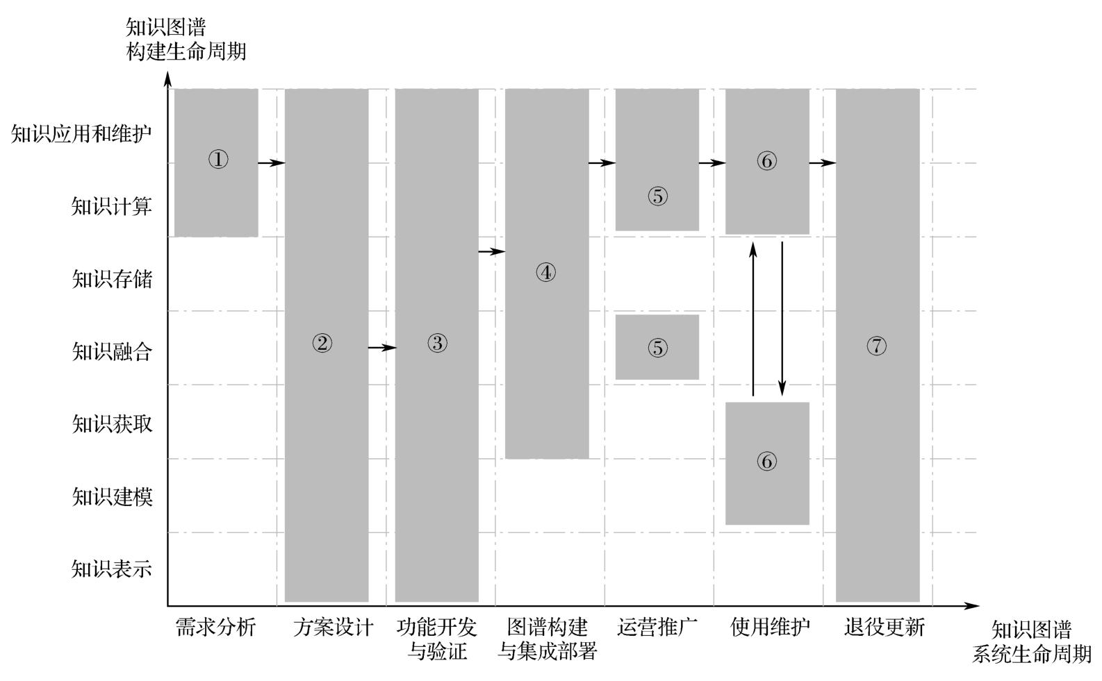 知识图谱生命周期根据构建过程,以及系统开发与部署过程的差异,从技术构成与工程实施视角,可细分为知识图谱构建生命周期和知识图谱系统生命周期两个维度。其中,知识图谱构建生命周期包括知识表示、知识建模、知识获取、知识融合、知识存储、知识计算、知识应用和维护等阶段。知识图谱系统生命周期包括需求分析、方案设计、功能开发与验证、图谱构建与集成部署、运营推广、使用维护、退役更新等阶段。