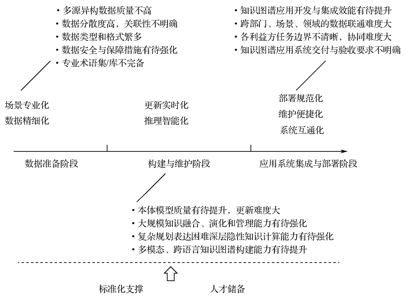 知识图谱构建所需的知识建模、知识抽取、知识融合、知识推理等理论有待完善,工程化实施部署中缺乏系统性标准支撑。