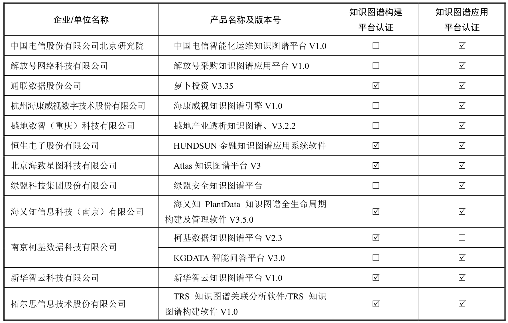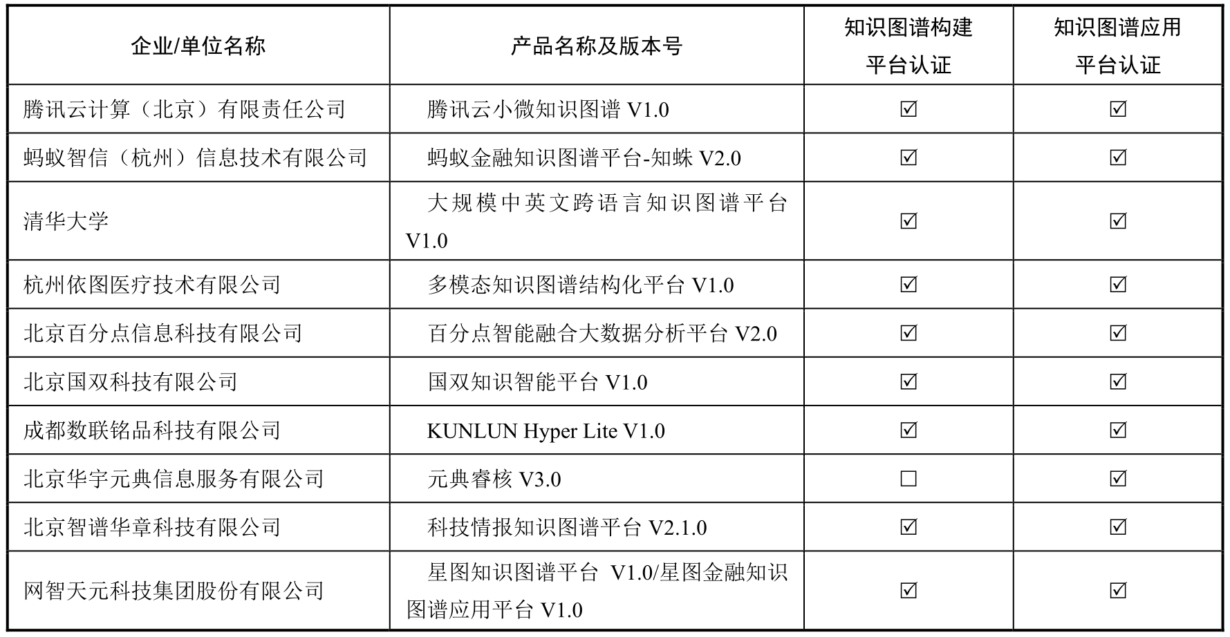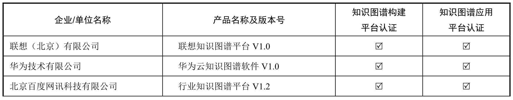 表1.3 第一批通过知识图谱产品认证的平台清单及其所属企业名称
