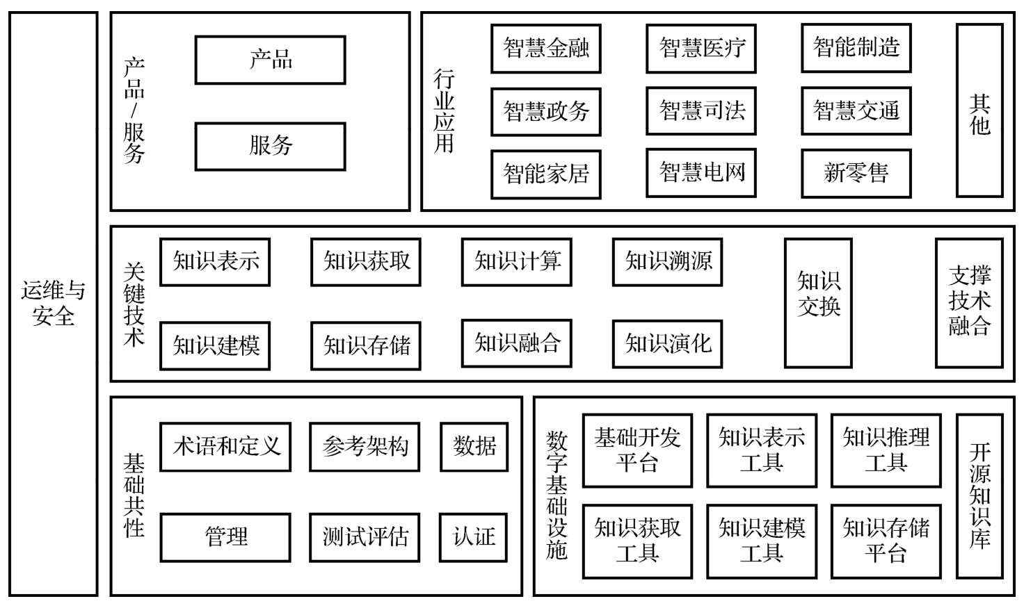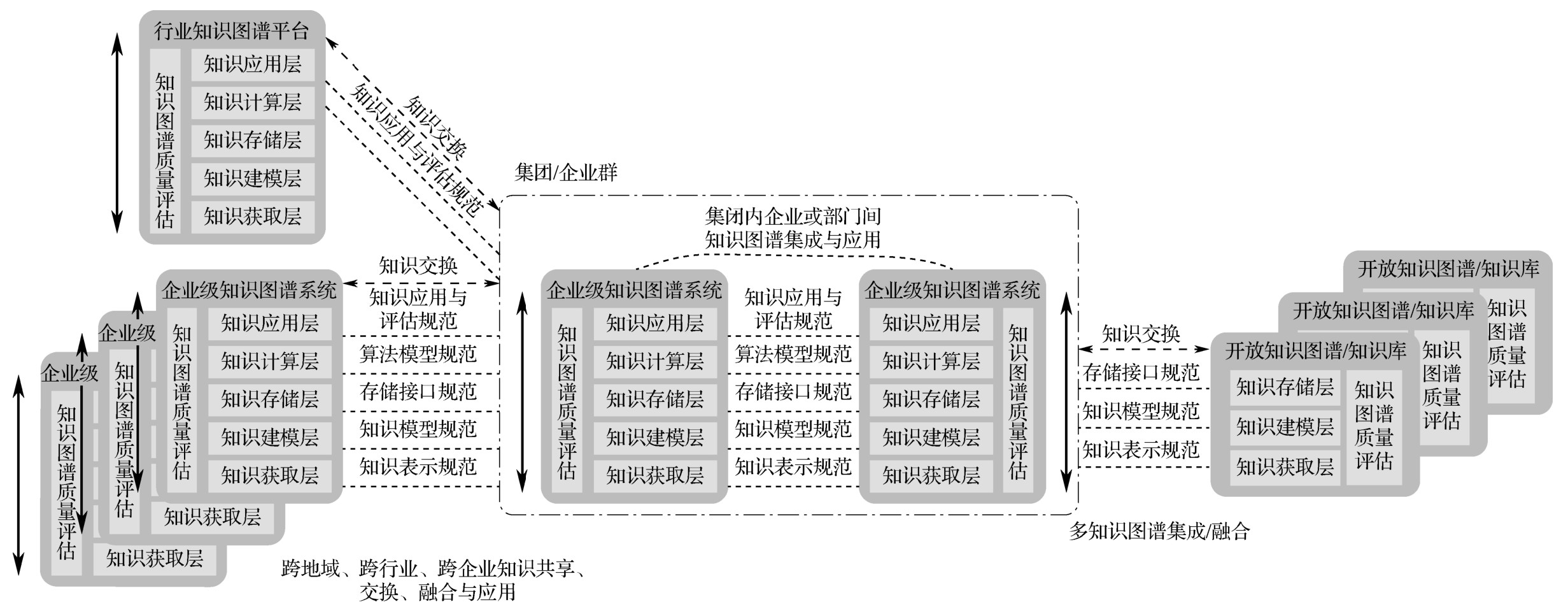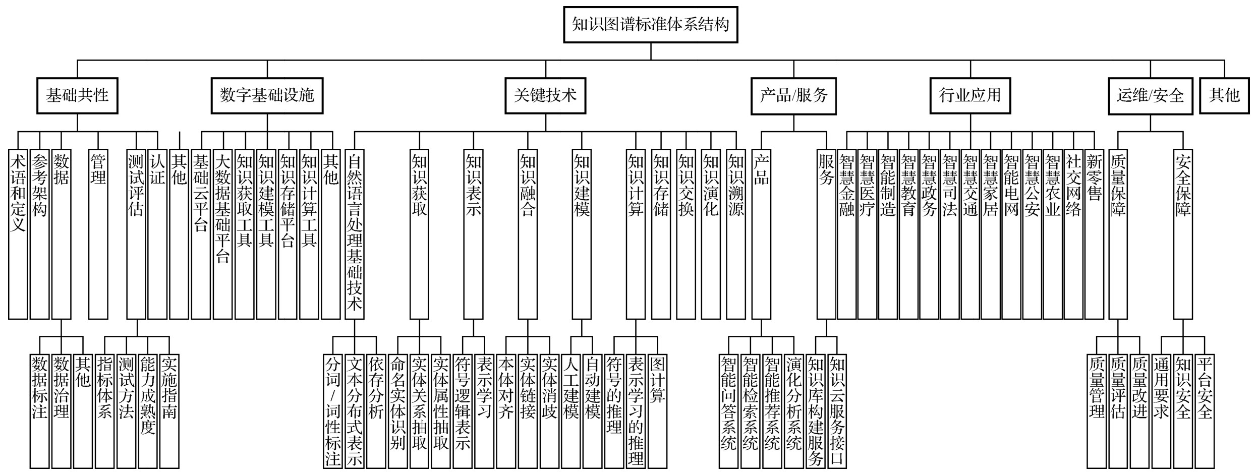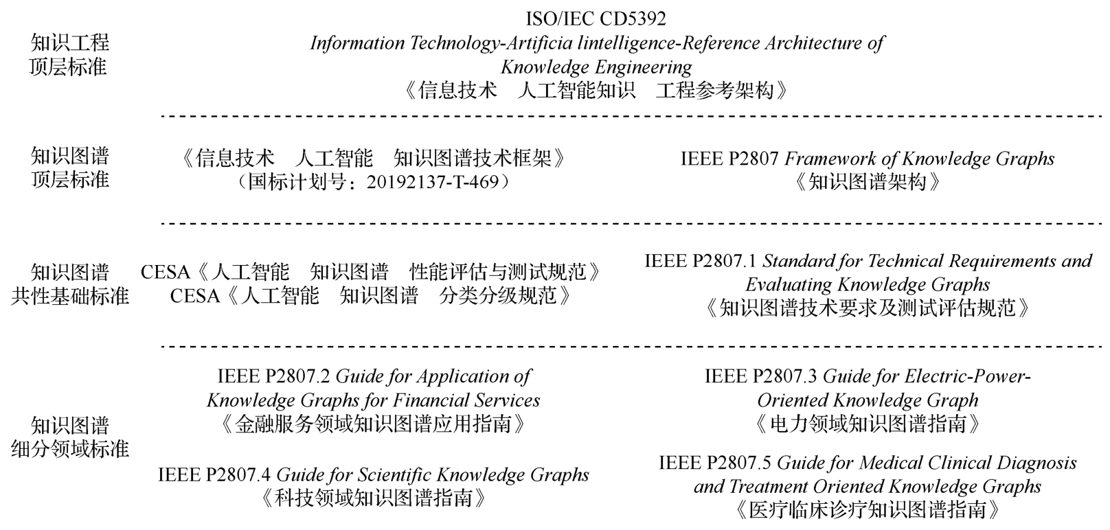 标准作为固化技术成果的重要形式,其在推动技术进步、促进应用融合、激发市场活力、规范市场秩序等方面发挥着重要作用。知识图谱的标准化对于提升知识图谱构建效率、推动数据在多领域复用、发挥知识图谱分析和技术价值有重要意义。近年来 RDF、RDFS、OWL等知识表示和知识建模相关标准为知识图谱的规模化构建及应用提供了重要的支撑作用,而且随着知识图谱在各领域的深化应用,知识图谱的技术框架、测试评估、能力成熟度模型、知识建模、知识融合、知识交换、知识计算及领域知识图谱构建与应用要求等方面的标准化需求日益攀升。此外,由于知识图谱系统日益增多,知识要素在行业内、集团内、企业间的安全交换与可靠流通需求也逐步显现,同样有待相关标准和配套工具来支撑。