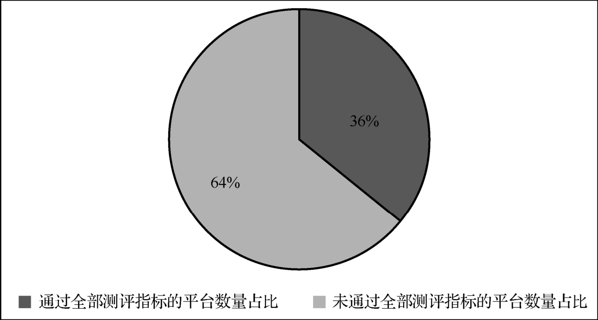 《知识图谱构建平台认证技术规范》《知识图谱应用平台认证技术规范》结合各企业实践,提出了基础性的功能和性能指标。然而,通过全部知识图谱构建平台测试指标的平台数量占比仅为11%,通过全部知识图谱应用平台测试指标的平台数量占比为36%,各平台整体能力仍有提升空间,如图1.8和图1.9所示。