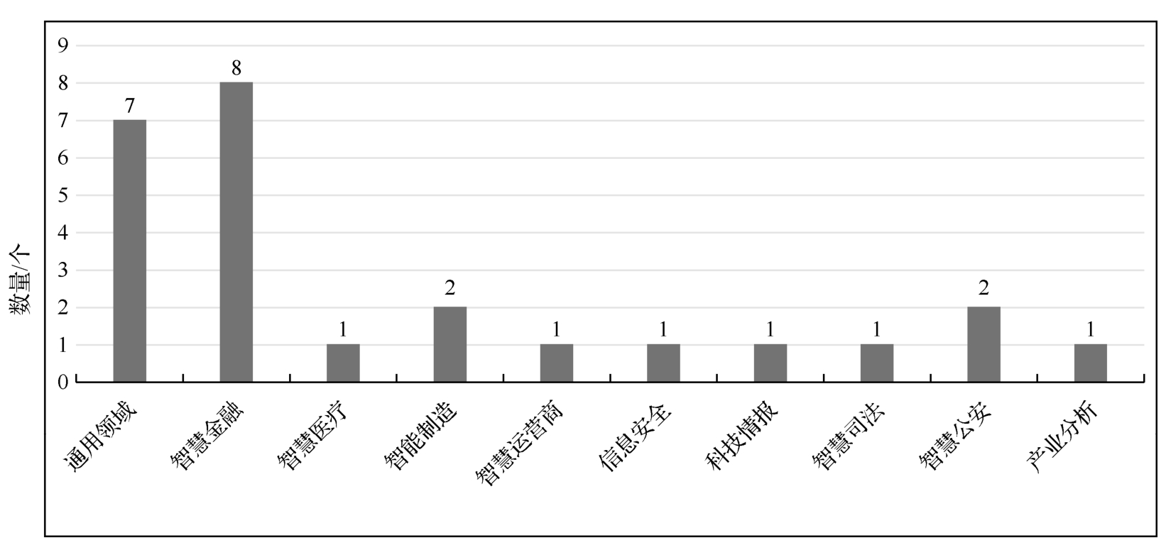 已通过认证的平台不仅包括了面向通用或跨行业知识图谱构建、应用与管理的平台,也包括了聚焦典型领域应用需求的知识图谱平台,共覆盖了智慧金融、智慧医疗、智能制造、智慧运营商、信息安全、科技情报、智慧司法、智慧公安细分领域。已通过认证平台数量的领域分布情况如图1.10所示。由图1.10可知,细分领域渗透率稳步提升。