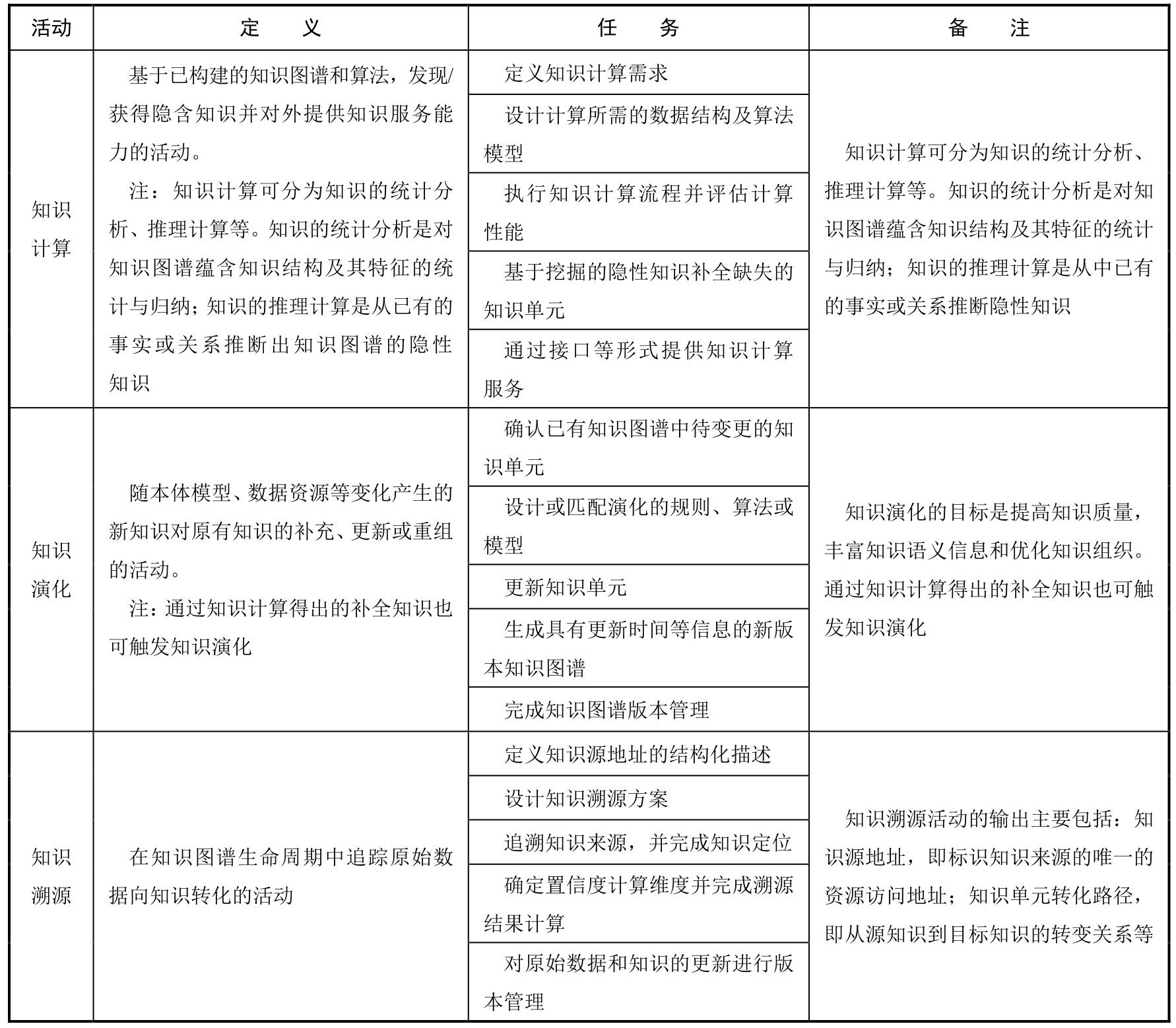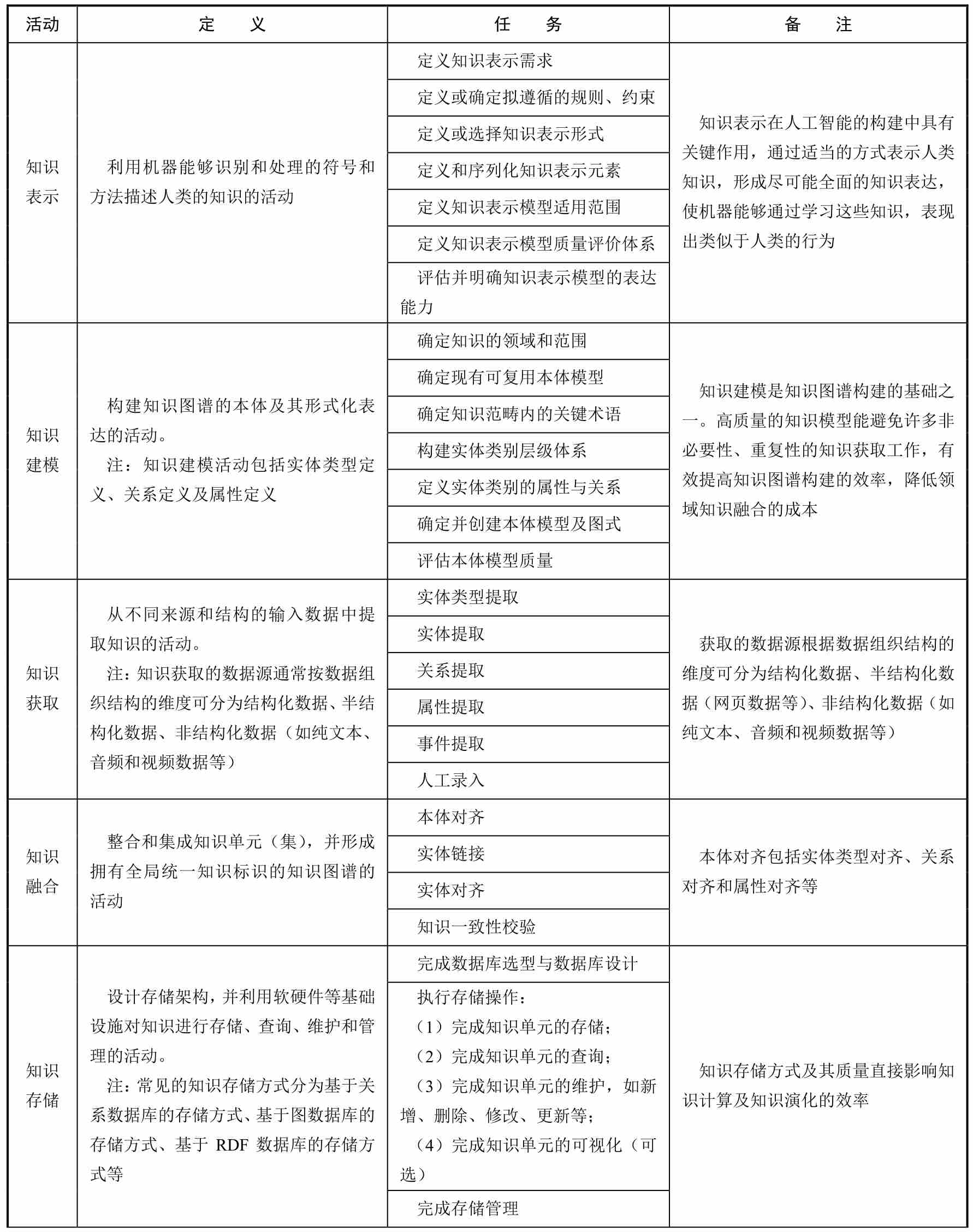 表1.5 知识图谱构建流程中各活动初步定义和任务组成描述