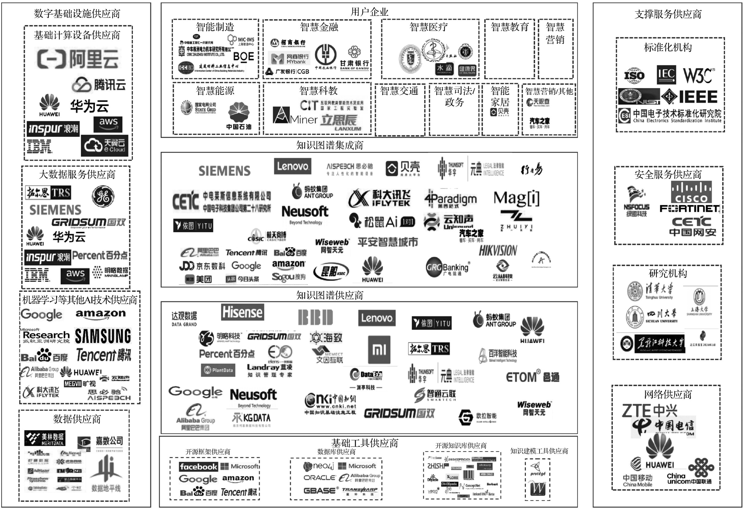 随着知识图谱和智慧金融、智慧医疗、智慧能源、智能制造等领域的快速融合,我国知识图谱产业化应用发展取得了明显成效,并初步呈现出知识图谱供应商、知识图谱集成商、知识图谱用户企业及知识图谱基础工具服务商、数字基础设施提供商、支撑服务提供商等知识图谱生态合作伙伴协同发展的产业生态体系框架。结合当前部分企业实践情况及机器学习、自然语言处理、机器视觉等其他AI 技术对知识图谱产业化应用的支撑作用,图1.13给出了知识图谱产业图谱示意。其中,基础工具供应商包括开源框架供应商、数据库供应商、开源知识库供应商、知识建模工具供应商,数字基础设施供应商包括基础计算设备供应商、大数据服务供应商、机器学习等其他AI技术供应商、数据供应商,支撑服务供应商包括标准化机构、安全服务供应商、研究机构、网络供应商。此外,需要说明的是,监管机构及数据治理服务商也是知识图谱产业生态的重要组成部分。
