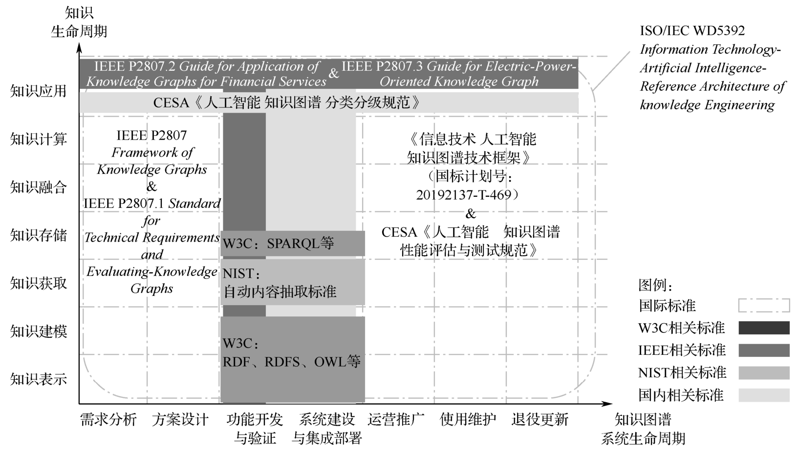 在知识工程标准化工作方面,2017年10月,ISO/IEC JTC1第32届全会上批准并成立了SC 42人工智能分技术委员会,主要在基础标准、计算方法、可信赖性和社会关注等方面开展了国际标准化工作。2020年8月23日,由我国提出的《信息技术 人工智能 知识工程参考架构》( Information Technology-Artificial Intelligence-Reference Architecture of Knowledge Engineering )国际标准提案在ISO/IEC JTC 1/SC 42正式获批立项(项目编号:ISO/IEC WD 5392)。该提案作为知识工程领域的首个国际标准项目,规定了知识工程参考架构,明确了知识工程重要术语和概念,描述了知识工程中的角色、活动、构建层级、组件及其关系。