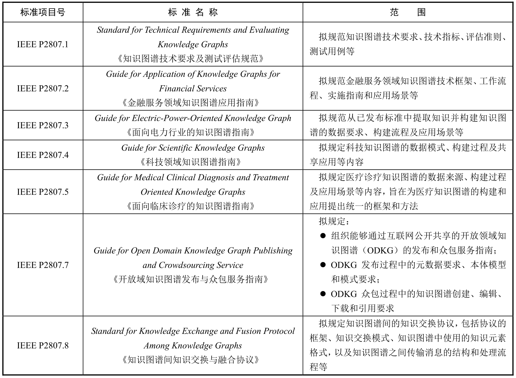 当前,该工作组已相继推动立项了8项标准,覆盖知识图谱测试评估规范,以及金融领域、电力领域、标准制修订领域等细分领域知识图谱构建技术要求,并有医疗领域知识图谱、科技信息领域知识图谱等多项潜在标准化需求正在论证中,初步形成了跨领域和细分领域标准协同推进的研制路线。IEEE知识图谱相关在研标准及其范围如表1.2所示。