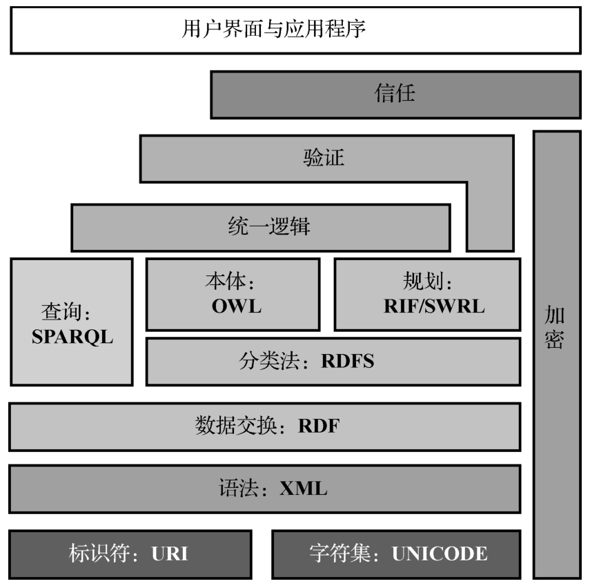 在知识图谱方面,W3C相关标准化工作主要集中在语义网知识描述体系方面,研制与发布XML、RDF、SPARQL、RDFS、OWL等系列标准,形成了一系列知识表示、知识建模、知识存储关键技术相关标准。语义网知识描述技术栈如图1.3所示。此外,W3C于2018年7月推动成立了人工智能知识表示社区小组,旨在探讨人工智能领域知识的概念化,以及规范的要求、最佳做法和实施选项等。