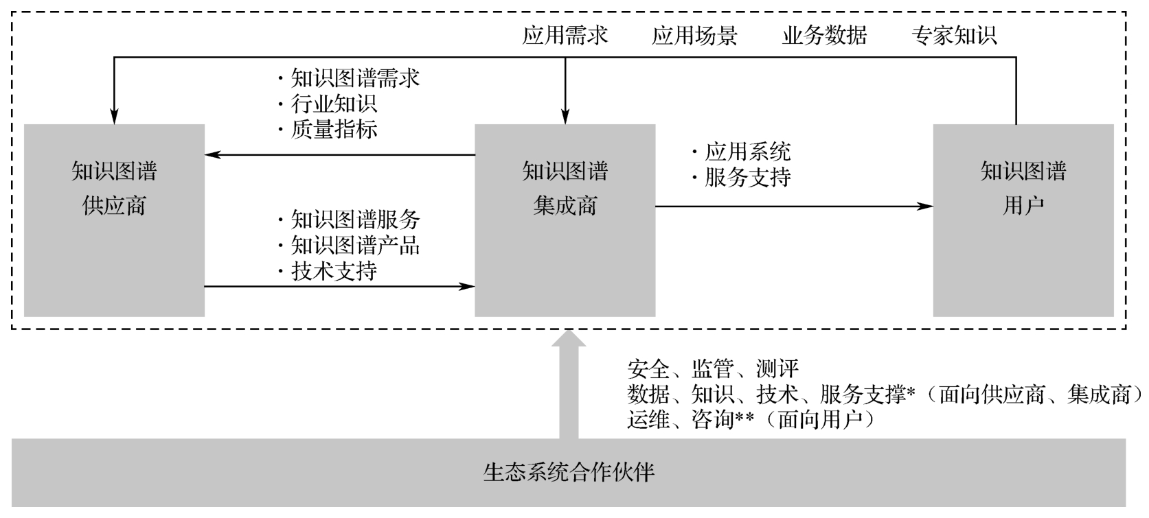 生态系统合作伙伴围绕知识图谱其他相关方的需求和标准,通过整合已有资源并开展相关工作,最终提供满足用户需求的成果物,如技术咨询报告、IT基础设施、数据和知识、安全保障服务、监管服务、评估认证服务、运维服务等。知识图谱其他相关方在知识图谱构建、集成和使用过程中,对技术、IT基础设施、数据和知识、安全保障、监管、评估认证、运维等方面产生的实际需求,是推动生态系统合作伙伴参与供给活动的基本动力。