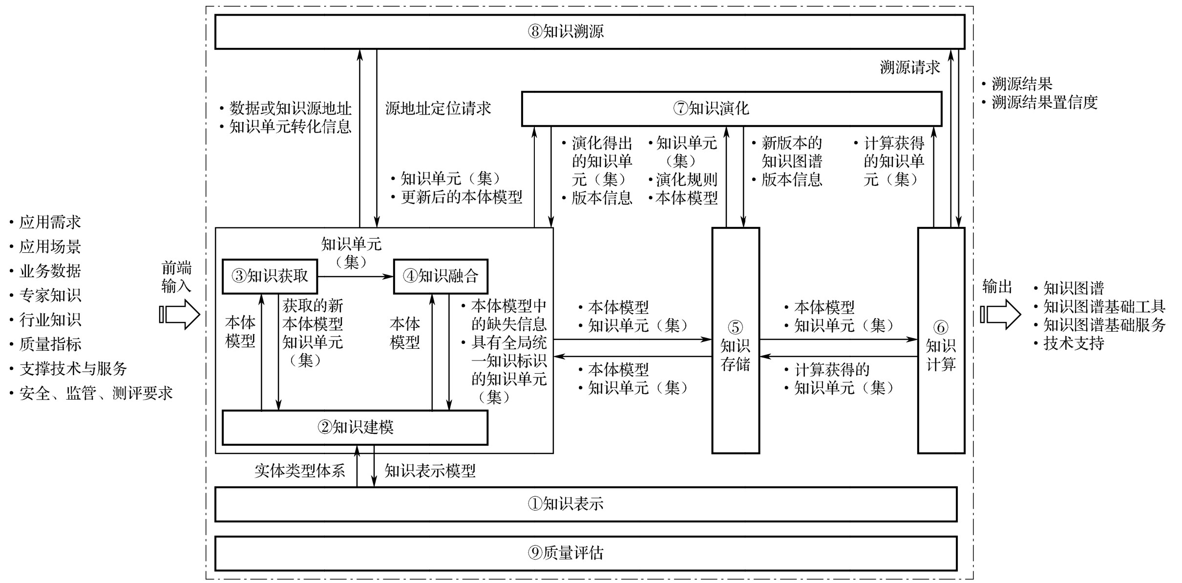 针对前端输入,应用需求主要用于明确所形成知识图谱产品或服务的整体架构、应用方向、应用场景和验收考核指标等;业务数据包括基础训练与测试数据、业务数据等,主要用于支持知识表示学习、知识获取等环节算法模型的设计、训练测试,以及后续知识图谱的构建;专家知识、行业知识主要用于支持知识建模、知识融合、知识计算等环节架构、算法,以及实现途径的设计、开发与验证;质量指标主要用于评估和控制知识图谱构建过程各环节的质量以满足应用需求;支撑技术与服务主要用于支持各环节实现过程中所需自然语言处理、机器学习、大数据等技术的融合与应用;安全、监管、测评要求等主要用于第三方管理或认证测评机构对知识图谱构建过程及最终输出产品或服务的质量监督等。