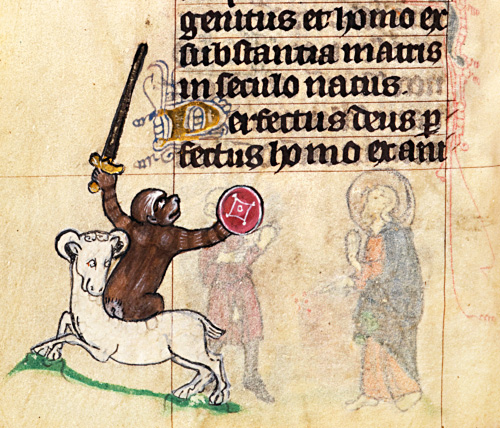 作为现存插图最完整的产于英格兰的动物寓言集之一,抄本764中“猴”的条目下以拉丁文白纸黑字写着:“猴和猿的唯一区别在于猴有尾巴。”若以这条标准看,出现在大部分页缘的猴子形象实际上是猿。在对林奈分类法一无所知的中世纪动物图鉴中,两者常被当作同一种动物对待,包括狒狒也是。抄本764对狒狒的记载是:“它们常见于埃塞俄比亚,跳得非常远,咬起人来毫不留情,永远无法被驯服,野性十足。”埃塞俄比亚对大多数中世纪英国人来说是不可能涉足的荒蛮之地,而将传说与经验、书本知识与观察所得当作同一类事实并置,这是典型中世纪博物志的写作方法。类似地,抄本764还指出拉丁文“猿猴”(simius)的希腊词源意为“鼻孔挤在一起”(虽然伊西多尔的《词源学》认为这个词源于“模仿”一词,该解释很可能更接近真相),并补充道:“它们的鼻孔确实挤在一起,面容可怕,充满褶皱,形如风箱;而且,母山羊也有一样的鼻孔。”且不论此处“而且”的行文逻辑,页缘装饰中猿猴的形象的确经常和山羊并肩出现,两者都被认为生性淫乱。比如在一张出自14世纪初尼德兰《马斯特里希特时辰书》的页缘画中,山羊背上的猴子骑士正向上方《阿塔纳修信经》中“完美的上帝,完美的人”(perfectus deo perfectus homo)这两行文字挥舞着剑和盾,猴子和山羊满脸戏谑和挑衅,对其理应提供图注的文本形成了反讽和颠覆。许多彩绘动物寓言集都包含这种内在不稳定性:图像时常在读者预期能够更直观地传递文本所指、帮助强化训谕之处意外地削弱、质疑、胳肢着文本,令原本确凿的教义变得触痒不禁。这种文本与图像拔河角力,直至一方濒临瓦解的情况也造成了研究着力不均的困境。现代学者往往不是把寓言集或页缘画中的动物当作纯装饰作品来描述,就是将既定的宗教文本仅作为古文书学的训诂对象,而对图文之间危险而迷人的张力鲜有深入。