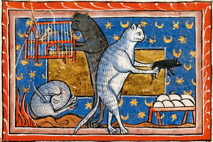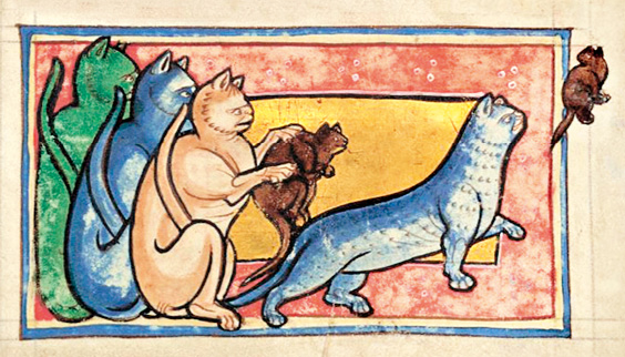 动物寓言集中动物分类、物种起源和象征寓意的叙述,很大程度依赖词源学——确切地说是伪装成词源知识的类比和联想。这两种思维方式也是中世纪人心智大厦的两块重要基石。譬如,抄本764这样解释母猪名字的来源:“母猪的拉丁文叫作sus,是因为它‘拱出’(subigat)食物来,也就是挖开土地觅食……它吸食秽物,在泥里打滚,弄得满身污水。”进而得出在道德寓意上贬损母猪的合理性:“贺拉斯说它是‘泥巴爱好者’。母猪象征有罪之人、不洁净之人和异教徒。”针对猫则说:“这种动物被称为‘捕鼠兽’,因为它杀老鼠,常用的名字是‘猫’……猫(catus)是希腊词‘狡猾’的意思。”在一本产自法国的动物寓言集中,作者却将猫的名字与清洁派(cathares)异端联想起来,得出“猫来自地狱,连夜从事异端活动,或者参加黑弥撒和魔法集会”的结论。老鼠没有被归入四足动物大类,更别提寓言集写作时代尚不存在的啮齿类,而是被大部分中世纪作者归入虫类,抄本764的解释是,它们“也诞生于土地中的湿气……肝脏随满月膨胀,随月亏萎缩”。14世纪意大利方济各会修士鄂多立克游历亚洲归来后记载,印度的老鼠和狗一样大,并且大象畏惧老鼠——鄂多立克看见的或许是印度随处可见的象头神伽内什(Ganesh)端坐在老鼠宝座上的神像。这并不妨碍寓言集画家们经过进一步联想,将猫、鼠、象合并入互相追逐的画面中。更多时候,老鼠被画得与黄鼠狼、狐狸或水獭相差无几,我们只有凭借叼在它口中的奶酪或正在捕食它的猫来判断其“鼠性”。