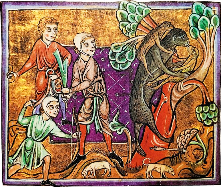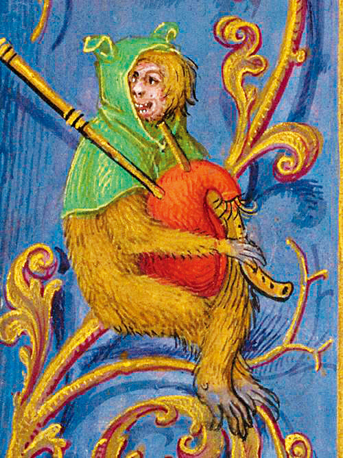 技艺、娱乐、劳作……有什么人类活动是猴子们不曾在手抄本页缘戏仿的?绘制于15世纪晚期的布鲁日、呈献给卡斯蒂利亚的伊莎贝拉一世的《伊莎贝拉祈祷书》是这类“群猴乱舞”抄本的一个精美范例。或许如图像学家迈克尔·卡米尔所言,“猿猴永远是一个符号,一种假扮成他者的符号”。而我们也不该忘记,一切手抄本页缘的动物或怪兽形象在中世纪都被统称为babuini(拉丁文)或babewyn(中古英语)——“像狒狒之物/属于猴子的”——那些在羊皮上劳作、奏乐、作战的页缘猴子,连同它们的全部闹剧、喜剧或悲剧,在中世纪读者眼中何尝不是这个被造的、远离了神意的尘世中人类处境的一种普遍隐喻?