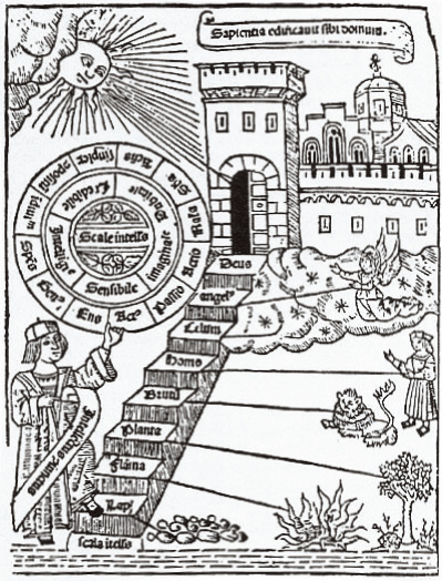 不妨先来看一下动物在中世纪人宇宙观中的地位。动物被称作中世纪“无处不在的他者”。一种始于亚里士多德而盛行于整个中世纪、影响直达启蒙时代及之后的赋予宇宙以结构的譬喻,将从灰尘到神的万事万物都不间断地串联起来,那就是“存在之巨链”或称“自然之梯”( scala naturae )。基于充盈性、连续性和递进性这三大原则,“存在之巨链”为宇宙中的一切造物安排了恰如其分的位置,默认能够存在的一切都已经存在,各自按其属性从高到低紧密排列在一条观念的锁链上,而“大自然不会跳步走路”( Natura non facit salt um )。