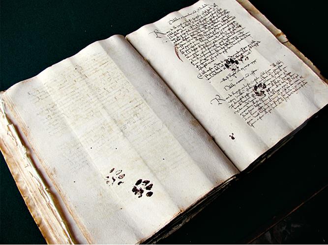 虽然中世纪修道院中常会养猫灭鼠,但猫自身也不是省油的灯,老鼠闯的一切祸猫都能闯,还可能在未完成的抄本上留下沾满墨水的脚印。一位在1420年工作的荷兰缮写士发现自己抄了一半的羊皮夜里被猫尿了,只好把剩下的半页留空,画上一只猫咪和两根直指尿渍的手指,添上这段针对全体猫儿的马后炮护书诅咒:“此处留白并非文本缺失,而是因为一只猫夜里在这里撒尿。诅咒那只在德温特的夜里尿脏本书的恶猫,也为此诅咒其他许多猫!下次一定当心,别把书摊开在猫晚上出没的地方。”