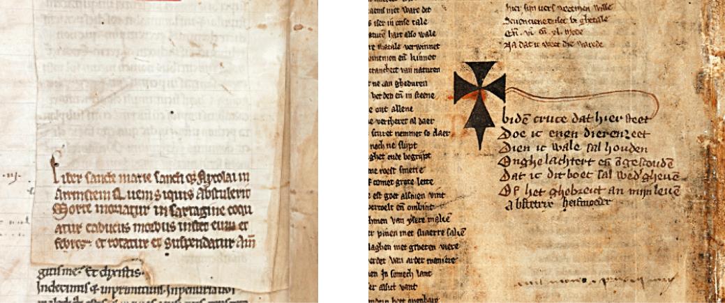 手抄本不仅贵比真金,而且往往是某个修道院或其他社群阅读某部作品的唯一途径,是缮写士们几年甚至十几年伏案劳动的成果。丢失一本书不仅意味着物质财富的丧失,更意味着失去通往某种精神真理或世俗知识的独一无二的钥匙。因而你可以理解,为什么少量对公众开放的中世纪图书馆每个座位旁都垂着铁锁链,并且诸多手抄本的扉页上写有“护书诅咒”(book curse)短语或短诗,以至于几乎形成了一个独立的文学传统。比如完成于12世纪德国、今藏大英图书馆的《阿恩斯坦圣经》( Arnstein Bible ,抄本编号BL Harley MS 2798)的拉丁文护书诅咒是这样写的:“这本书属于阿恩斯坦的圣母玛利亚与尼古拉斯修道院:假如任何人偷走这本书,愿他死去,愿他在煎锅里烤焦,愿癫痫和热病击倒他,愿他在刑轮上转动,愿他被吊死。阿门。”类似地,一本制作于14世纪尼德兰的中古荷兰语百科全书《自然之花》( Der Nature Bloeme ,抄本编号BL Add MS 11390)在一个十字形状下抄有一段“护书死亡宣誓”,说明借书者已郑重起誓,一旦借书不还,其人就会死去;只有一位自称“助产妇”的女性借阅者勇敢地在下方签了字。“还书还是不还”变成了“生存还是毁灭”的问题。