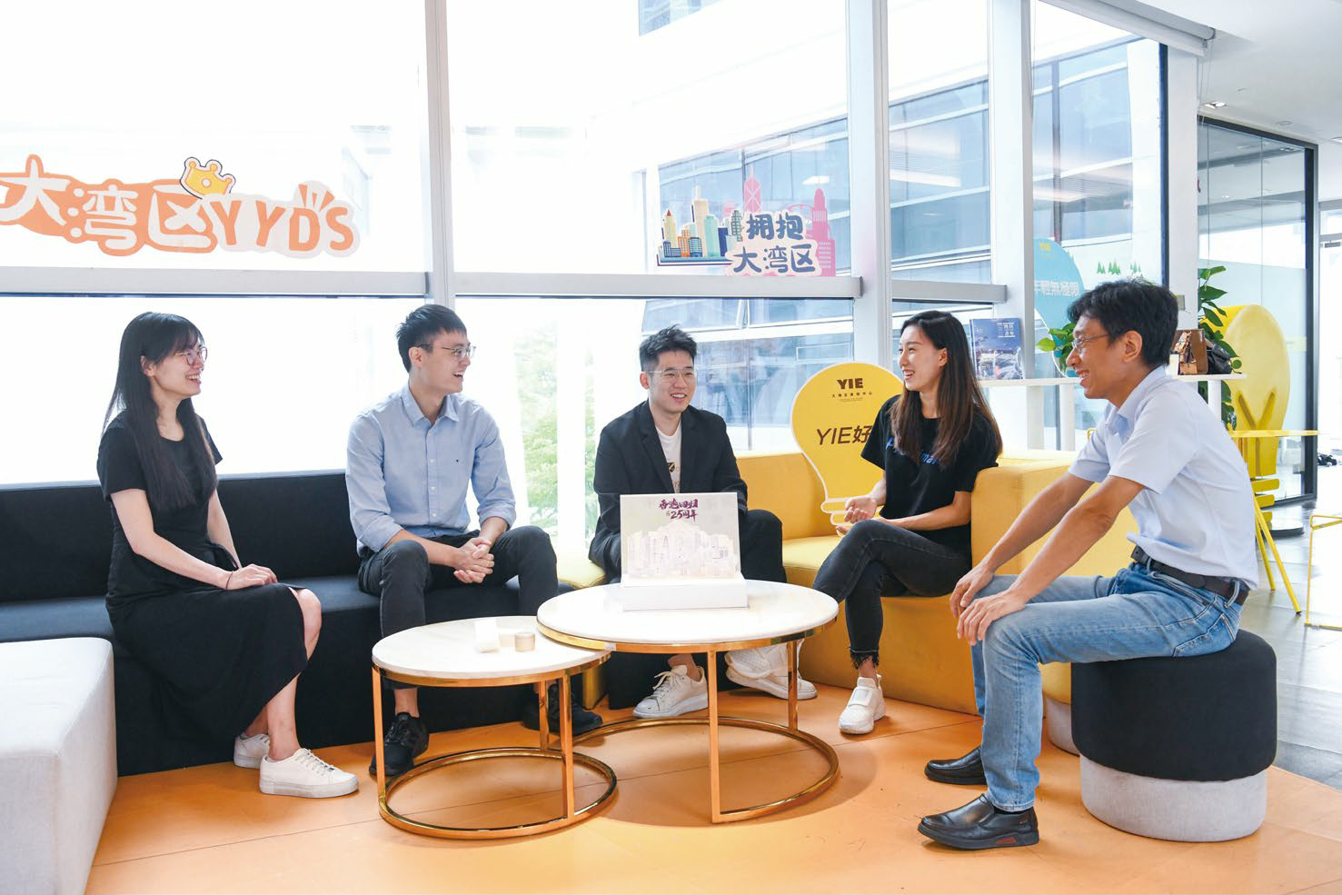 2022年6月20日,在位于深圳市的前海深港青年梦工厂,香港创业青年们一起交流各自的创业项目。(梁旭摄)