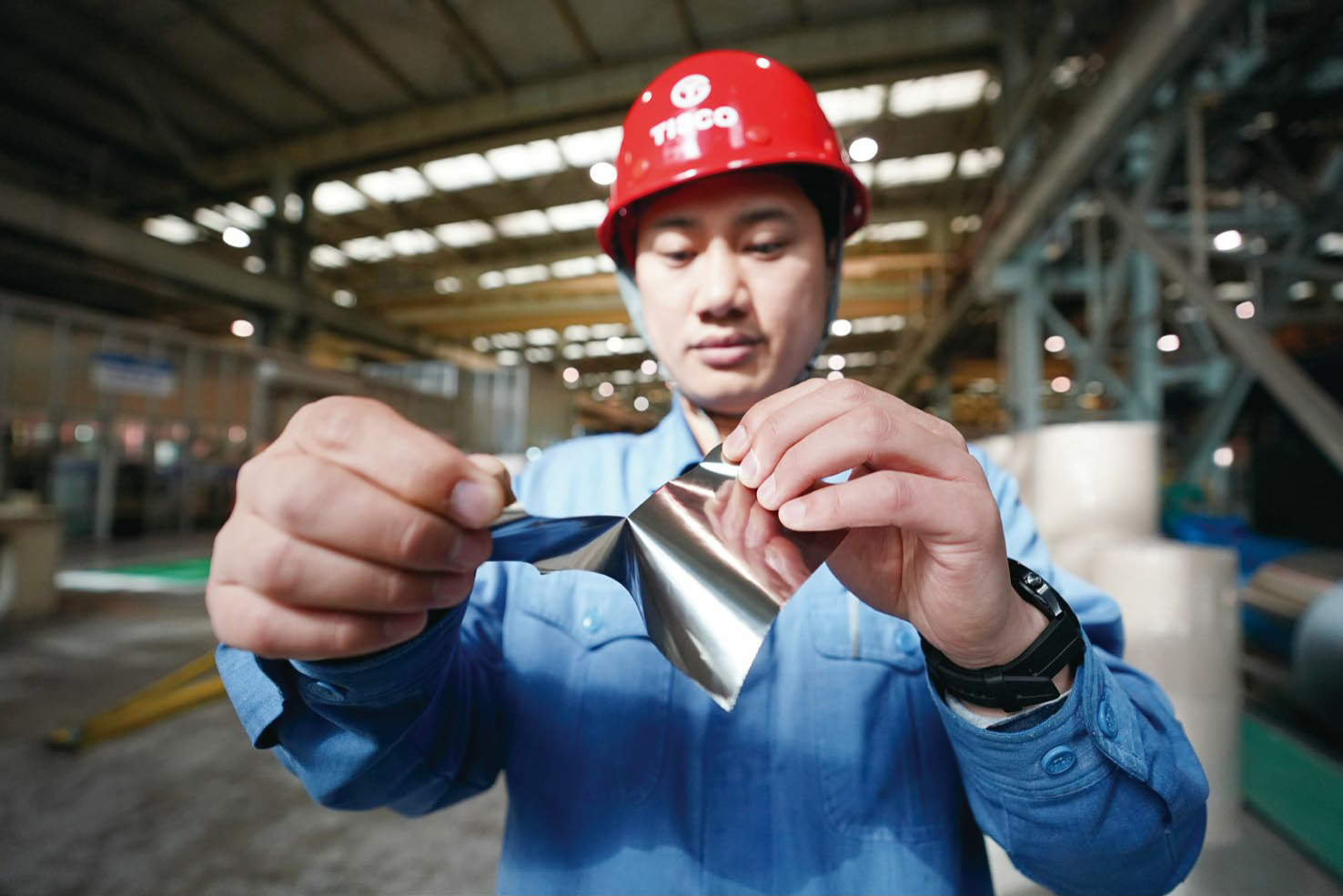 2022年3月31日,在位于山西省太原市的中国宝武太钢不锈钢精密带钢有限公司,工作人员展示用手撕开超薄精密不锈带钢。(詹彦摄)