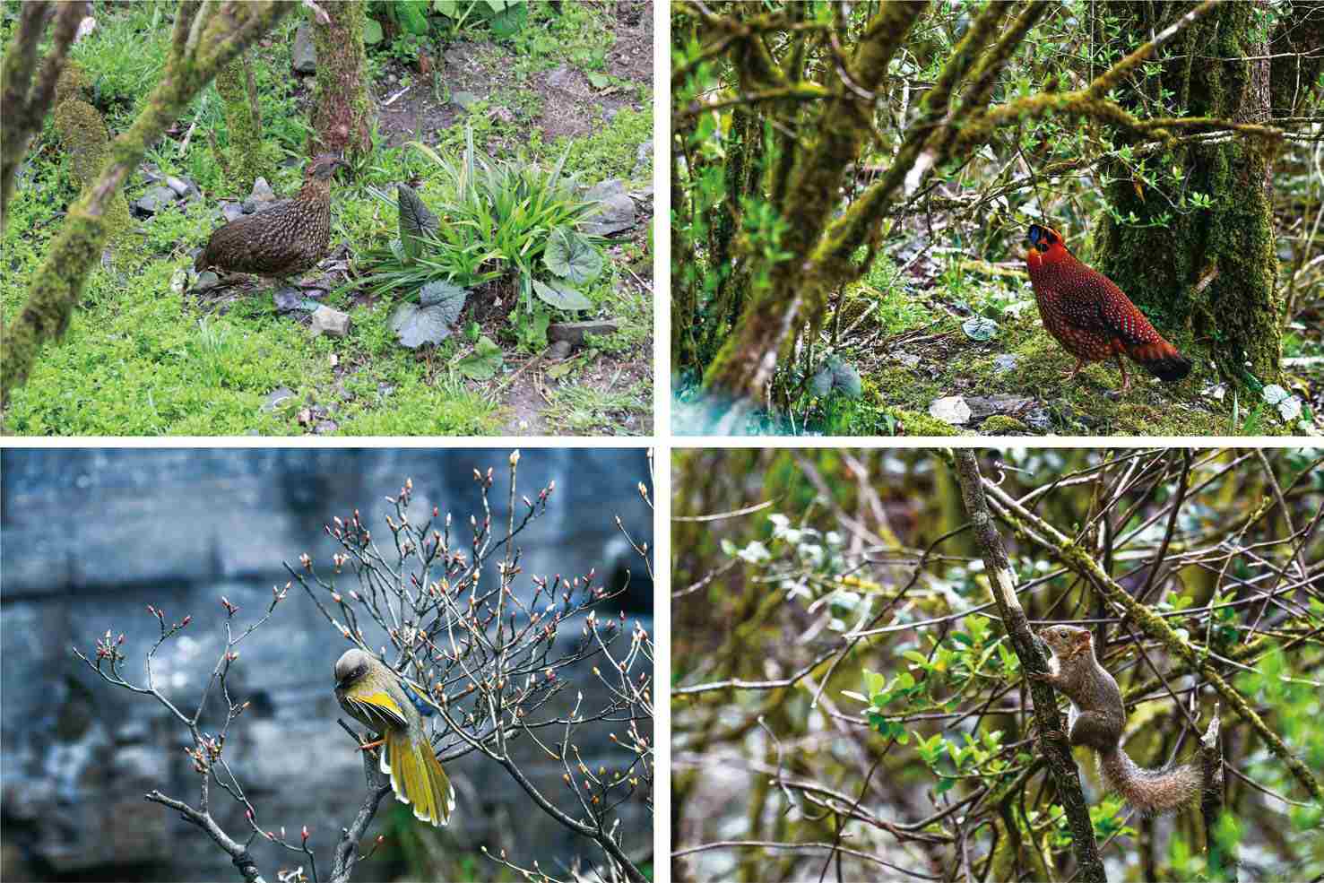 2022年4月20日在贵州梵净山国家级自然保护区拍摄的小动物。左上图为红胸角雉雌鸟(李鹤摄);左下图为橙翅噪鹛(杨文斌摄);右上图为红胸角雉雄鸟(杨文斌摄);右下图为松鼠(杨文斌摄)。