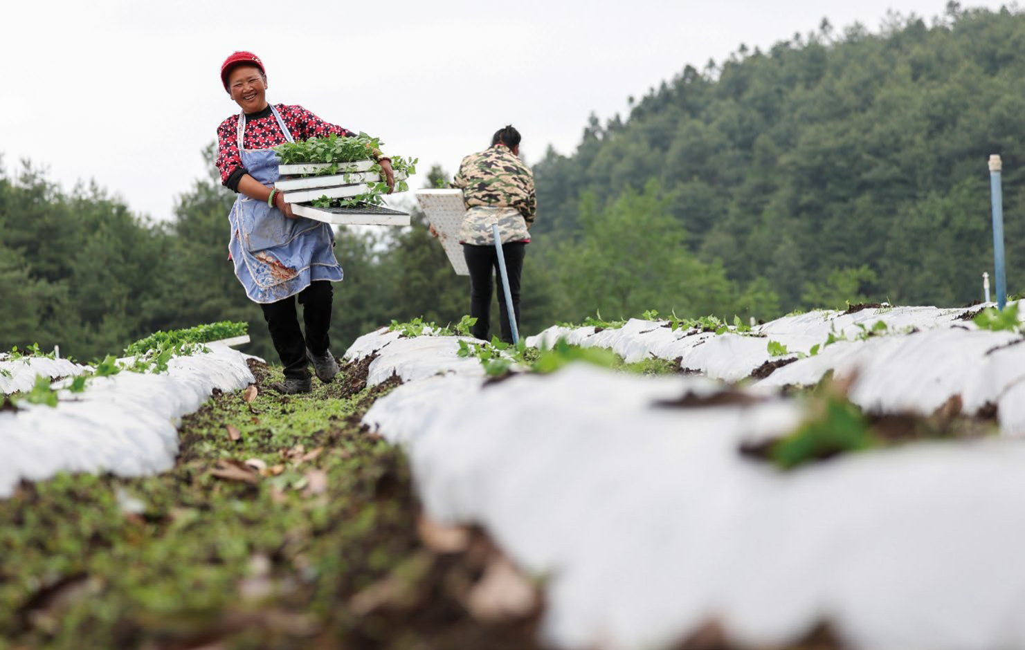 2024年4月20日,贵州省毕节市赫章县平山镇中山社区农户在田里搬运辣椒苗。(韩贤普摄)