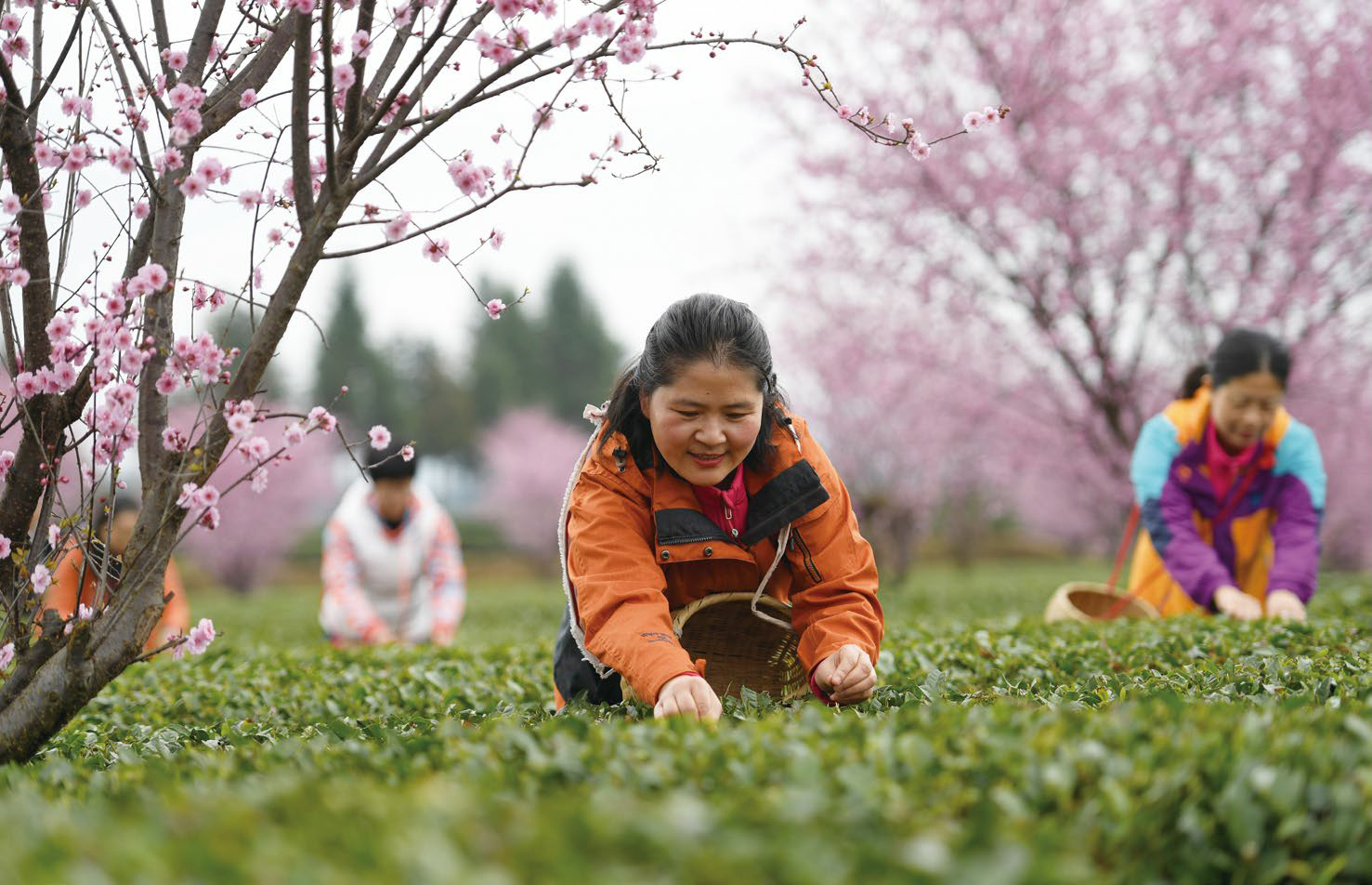 2024年3月16日,茶农和体验采茶的游客在贵州省凤冈县永安镇田坝社区生态茶园基地采摘春茶。(杨楹摄)