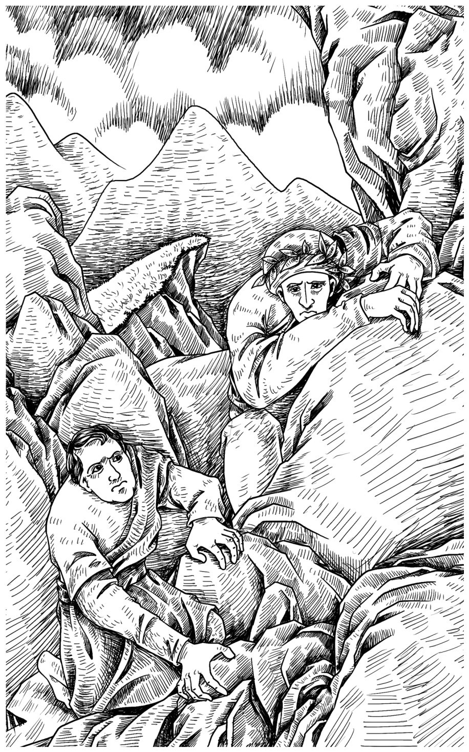 ”那个罪人听我这样说,不再隐瞒,他的眼光及注意力都集中于我,一层羞耻的红晕浮现在他脸上,他说:“我的罪恶比你刚才说的还大。你想知道,我不会拒绝。我之所以落入此地,是因为我偷走了教堂中的圣器,又将这罪恶推到了别人身上。