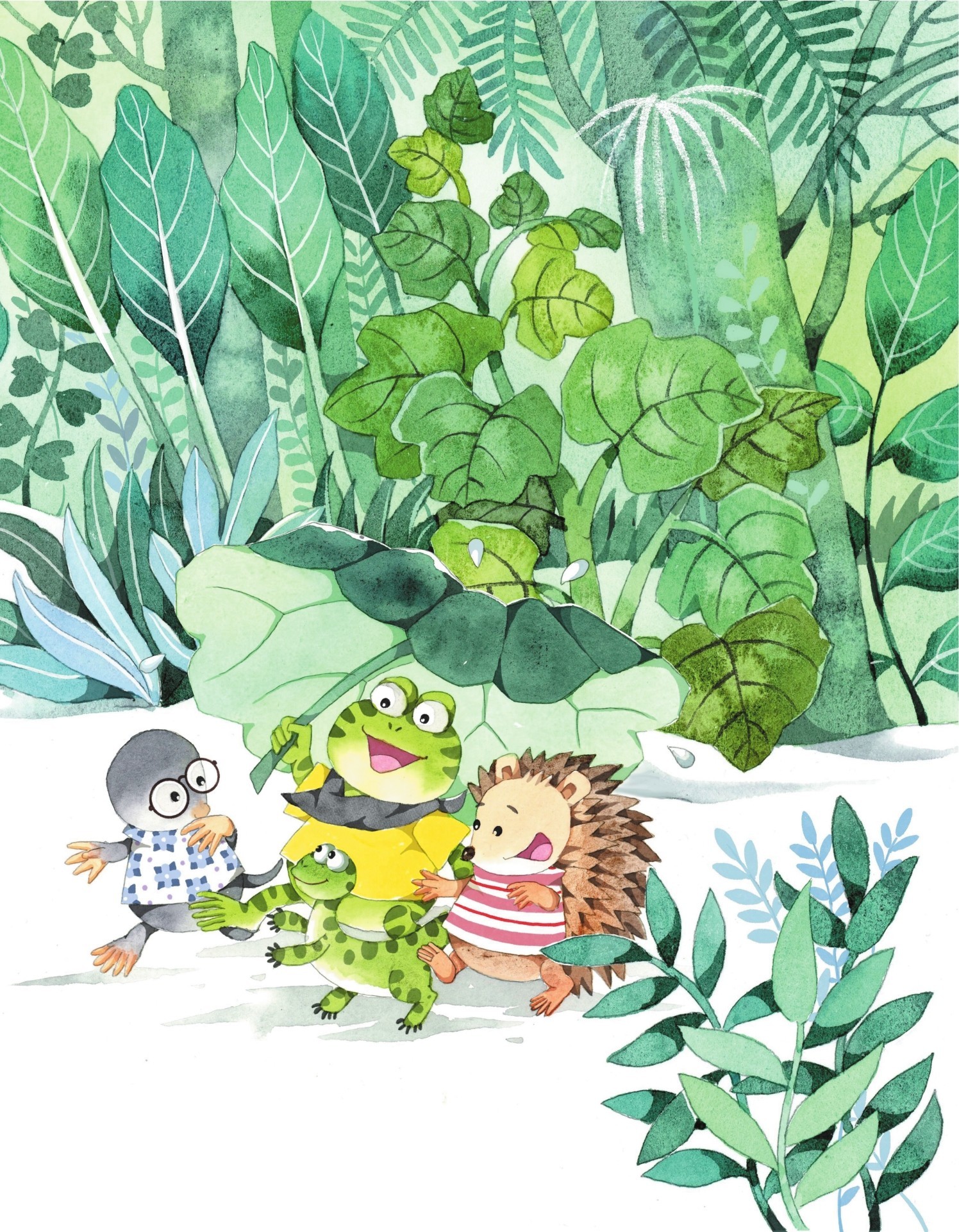 他们走到一棵牛蒡草边上,看见小刺猬、小鼹鼠和抱着脑袋的小蜥蜴正在躲雨。牛蒡草叶子太稀少,雨点儿还是无情地浇在他们的头上。