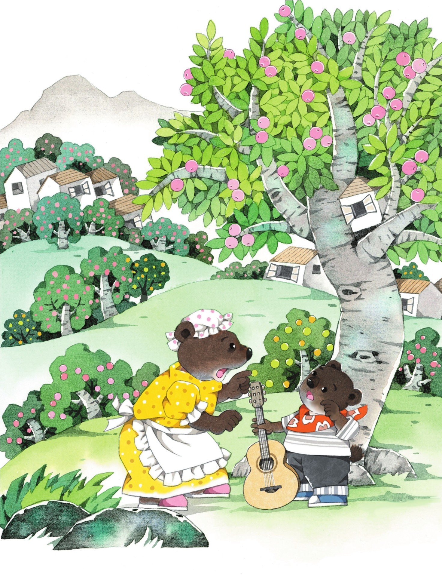 小黑熊面对着一排小木头房子,坐在一棵大苹果树下,拨动琴弦,唱了起来: