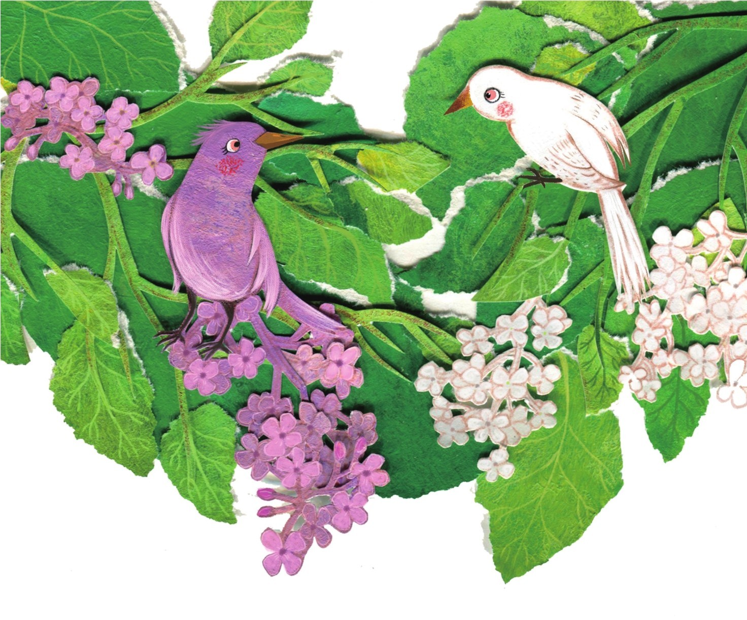这时候,飞来了两只小鸟,一只长着洁白的羽毛,一只长着紫红的羽毛。白鸟落在白丁香树上,紫鸟落在紫丁香树上。