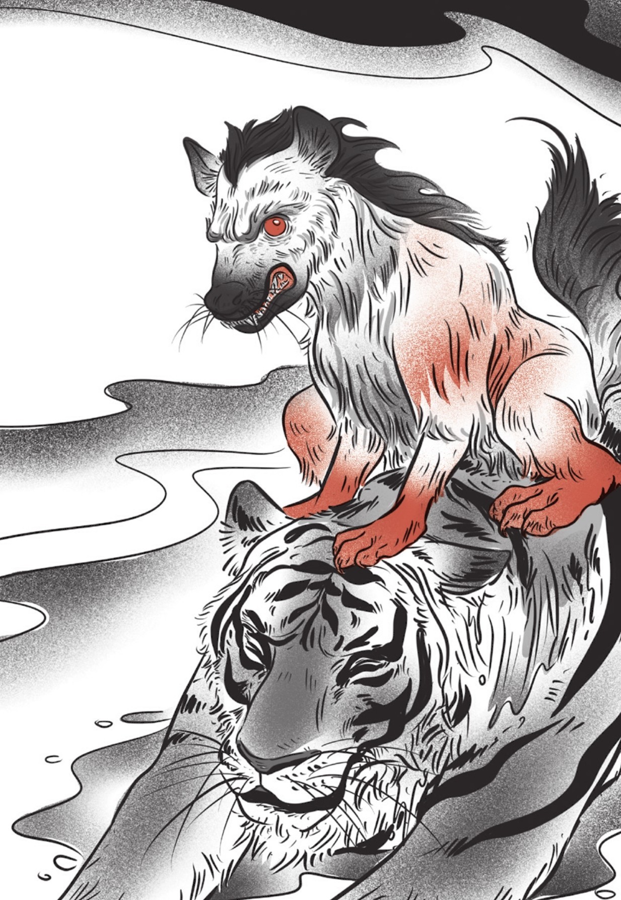 没想到,这猛兽见到了老虎,表现出一副欢喜的样子。它舔着嘴唇,摇着尾巴,直接跳到了老虎头上,还对着老虎的头撒了一泡尿。老虎受此挑衅却不为所动,仍然闭着眼睛,低垂着头颅,匍匐在地不敢动弹。