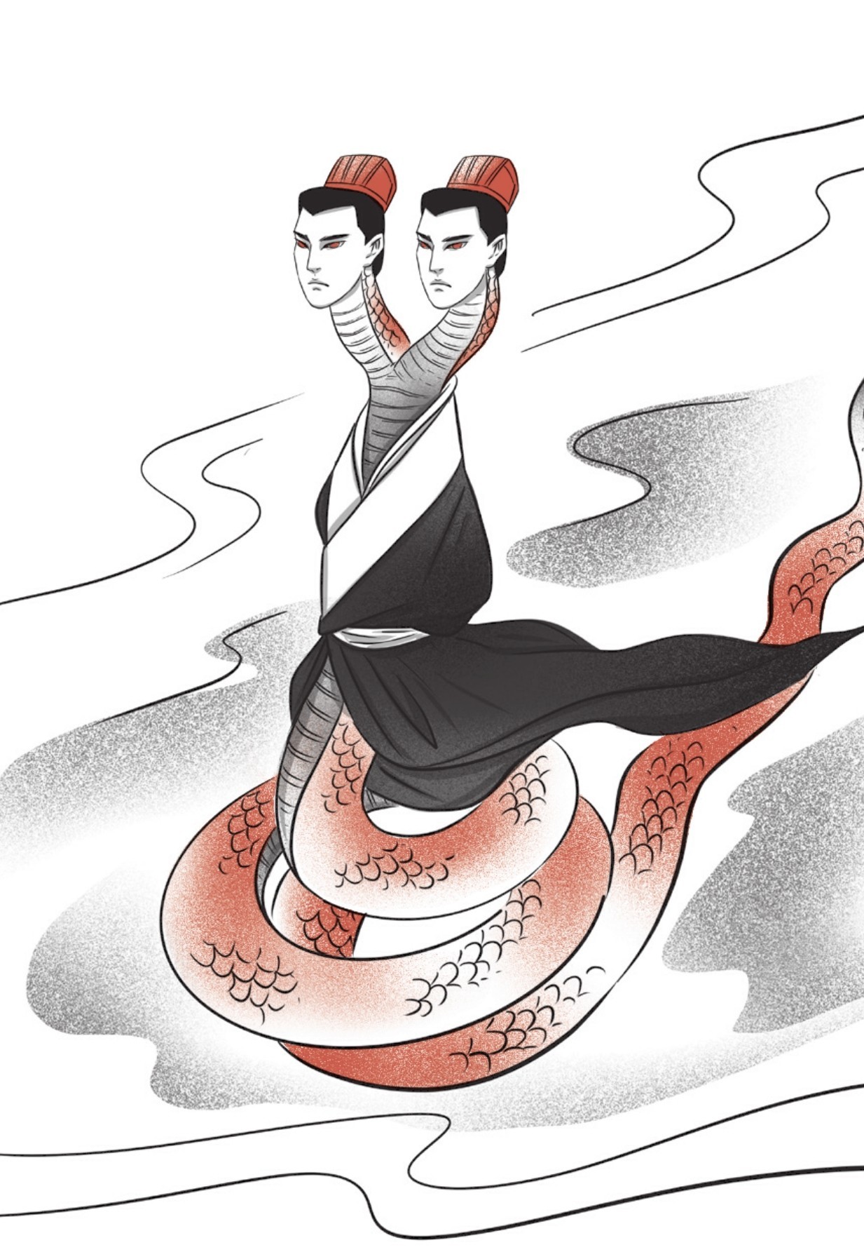 水泽中有一种蛇,名叫委蛇(yí),形状如同车毂,和车辕一样长,如果有人见到了它,那么就会称霸天下。委蛇也叫作延维,是一位人首蛇身的神明,身长如同车辕,左右各有一颗头颅,总是穿着紫色的衣裳,戴着红色的帽子。它很厌恶雷车的声音,如果听到了雷车的声音,就会捧着头站在路边不动。如果有人看到了它,就可以称霸。