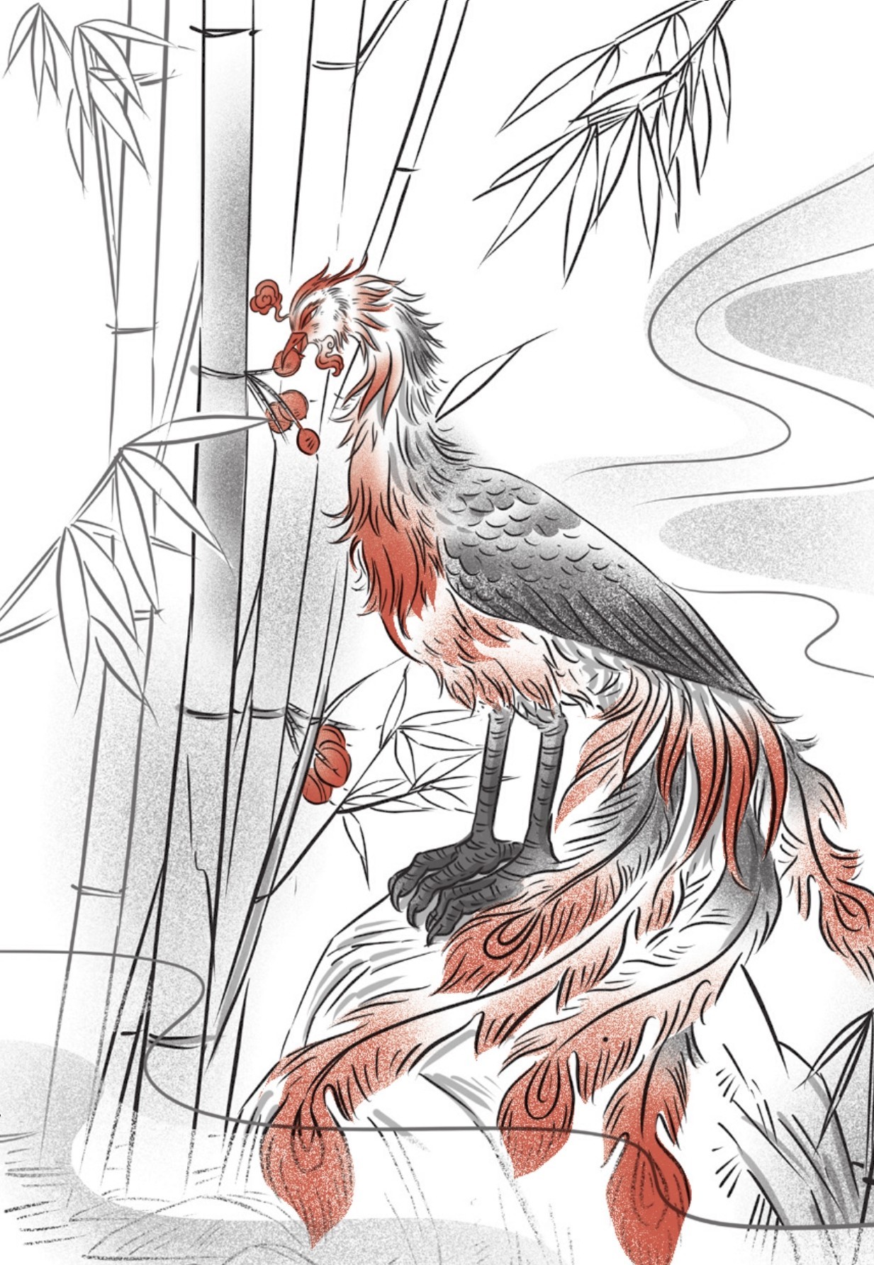 止些山生长着很多竹子,这些竹子有千仞之高,凤凰会食用竹子的果实。止些山离九疑山大概有一万八千里的距离。