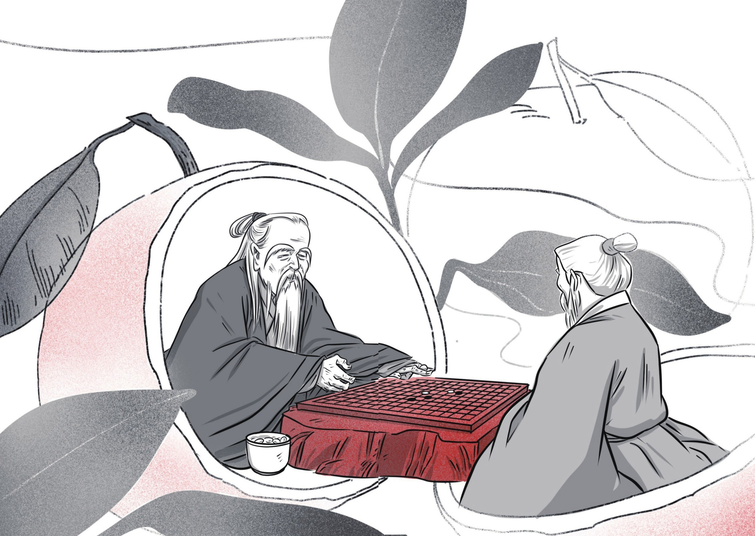 橘子剖开时,其中两个老者正在下棋,他们谈笑自若,并不因为橘子被剖开感到惊慌,只一心要决出这盘棋的胜负。一个下棋的老者说道:“你如果输给我了,那要给我龙神第七个女儿的头发十两,智琼仙女额间的花钿十二枚,紫绢帔一副,绛台上的霞宝散三十二斗,瀛洲的玉尘九斛,王母所酿造的酒四盅,王母女儿态盈娘子的跻虚龙缟袜八双,后天在王先生的青城草堂将这些东西交给我。”