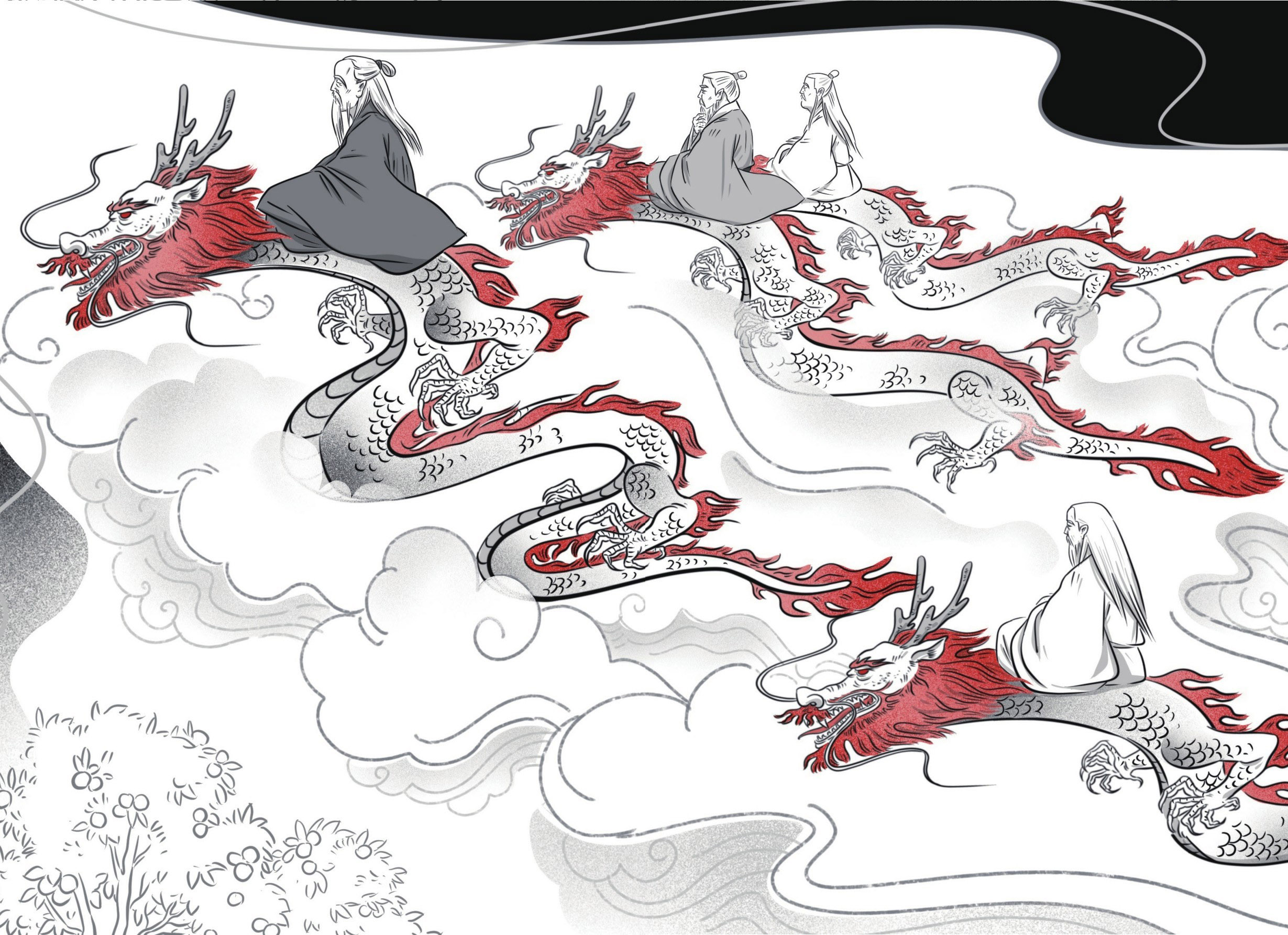 老头食用完毕,拿来清水含在口中,喷在草根之上,草根瞬间化为飞龙,四个老头依次骑上龙身,从容地飞走。此后的一百五十年,橘中仙人的故事一直在巴邛之地流传,按照时间推算,那应该是发生在南陈、隋朝时期的故事,但不知道具体的时间。