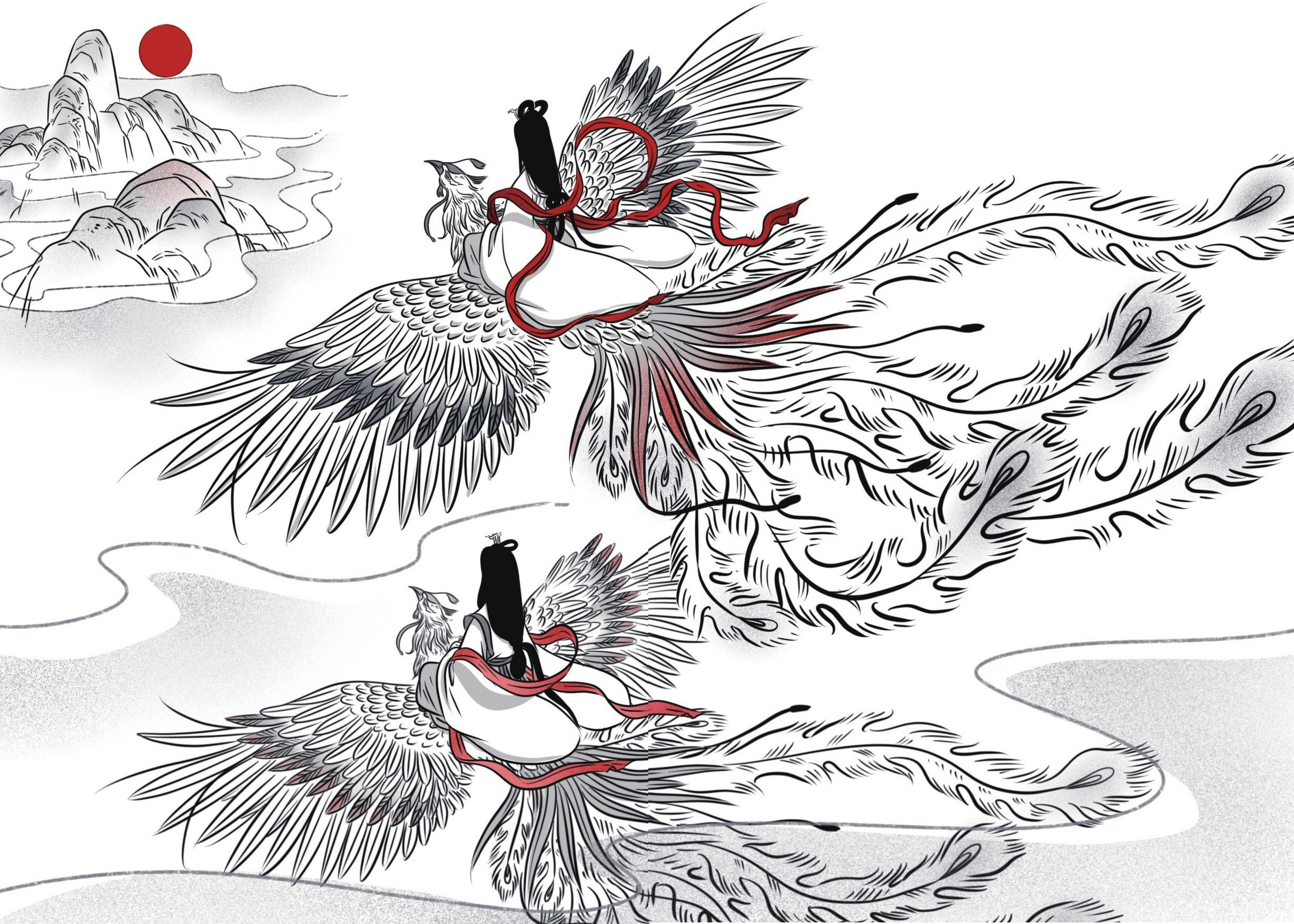 忽然,有丝竹之声传来,又见五色云彩从庭院中升起,原来是两只凤凰腾空飞翔。张老妹妹与韦氏各骑了一只凤凰,身后跟随了十几个骑鹤的随从。她们越飞越高,往东而去,慢慢地,她们的身影消失在天际,而丝竹之声犹在耳畔。韦义方留在家中休息,家中的侍女殷勤周到,非常恭谨。暮色将至,韦义方隐隐听到乐声,还未反应过来,妹妹已经到了庭院中。