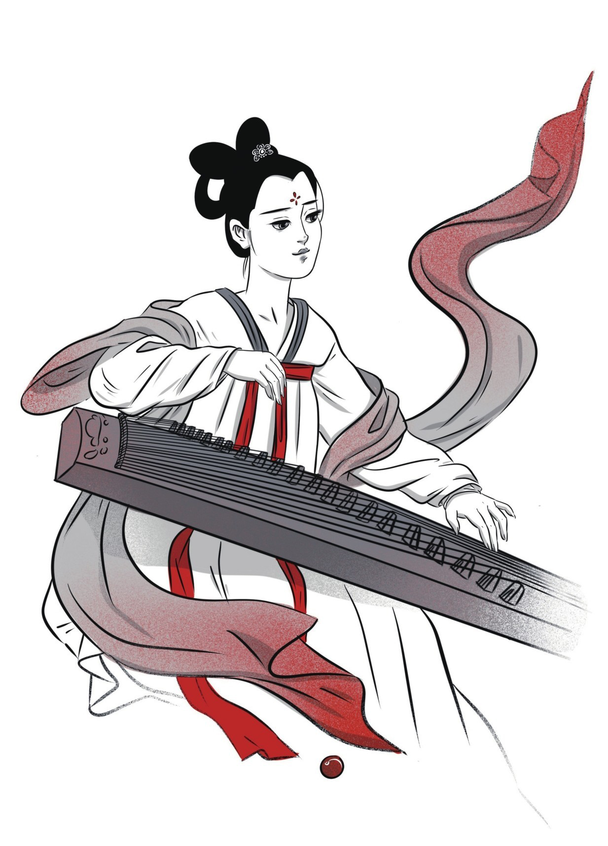 裴湛令赵氏坐在玉阶之下,一个青衣侍女捧着玳瑁筝走了过来,将玳瑁筝递给了赵氏。这玳瑁筝本是赵氏最为擅长的乐器,于是裴湛又令赵氏与众歌伎合奏助兴。王敬伯偷偷将案几上的黑李扔给赵氏,赵氏会意,将黑李系在了衣带上。歌姬们所奏的曲子,赵氏不能跟上,裴湛便吩咐乐师们配合赵氏演奏,赵氏所奏之曲虽不是《云门》《大韶》这样的古乐,却也清亮婉转,一时宾主尽欢。