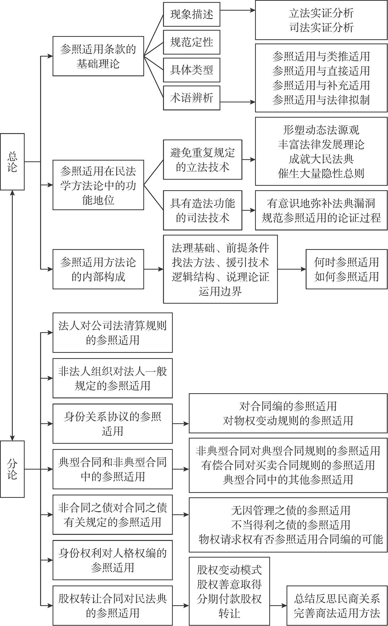从本体构成角度,参照适用方法论总论部分主要回答两个问题:何时参照适用?如何参照适用?具体又包括谁来参照、何事要参照、参照什么、应当参照还是可以参照,以及参照适用的法理基础、前提条件、找法方法(被参照适用条款的具体化)、援引技术(完全法条的呈现)、逻辑结构(类比推理)、说理论证(相似性论证)、运用边界等。