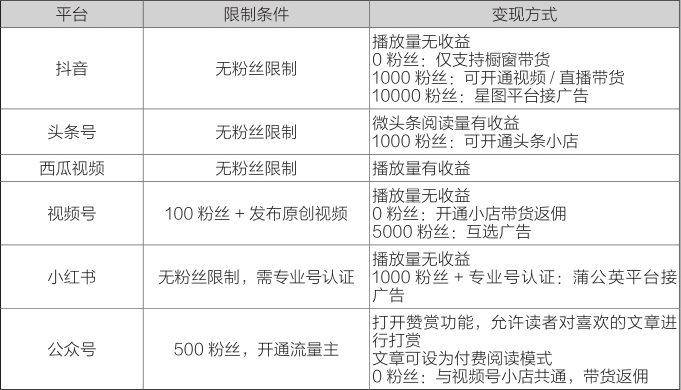 主流新媒体平台流量变现条件一览表